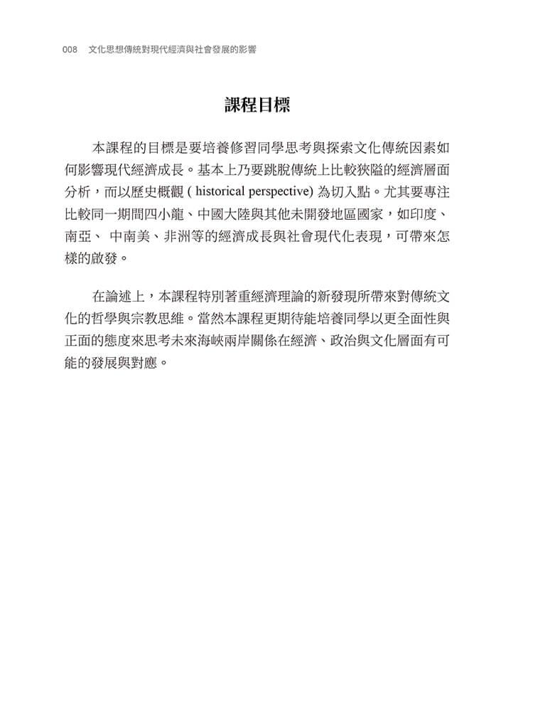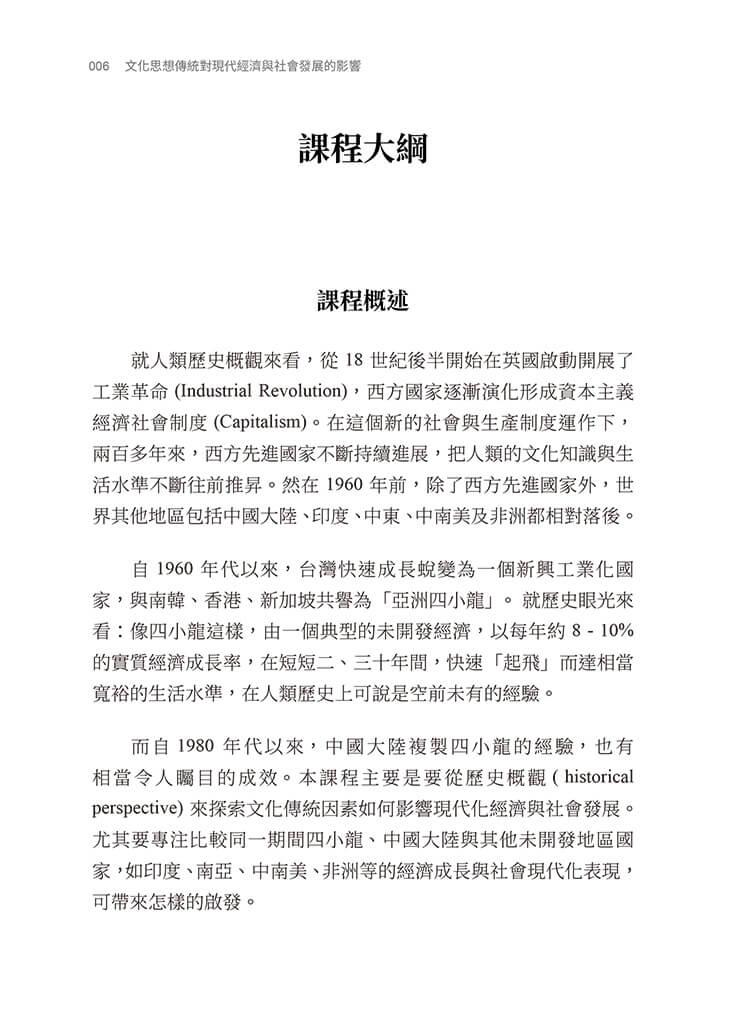 本書主要是要從歷史概觀 ( historical perspective),來探索文化傳統因素如何影響現代化經濟與社會發展。尤其要專注比較同一期間四小龍、中國大陸與其他未開發地區國家,如印度、中南美等的經濟成長與社會現代化表現,看看可帶來怎樣的啟發。
