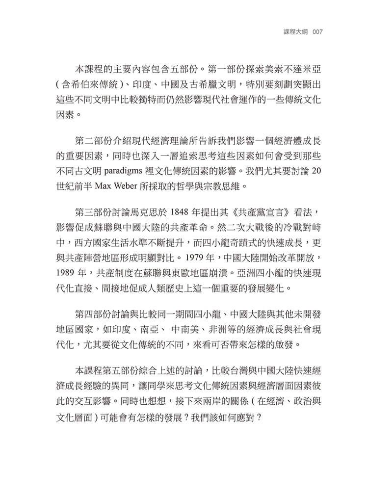 第四部份討論與比較同一期間四小龍、中國大陸與其他未開發地區國家,如印度、中南美等的經濟成長與社會現代化,尤其要從文化傳統的不同,來看可否帶來怎樣的啟發。