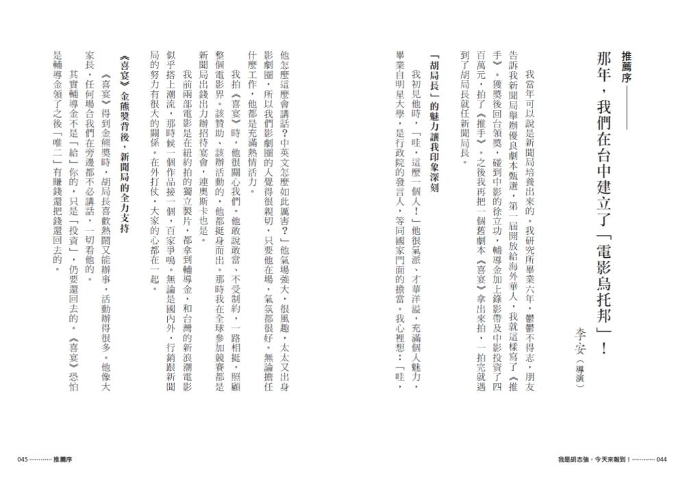 他(胡志強)敢說敢當、不受制約,一路相挺,照顧整個電影界。該贊助、該辦活動的,他都挺身而出。——李安/導演