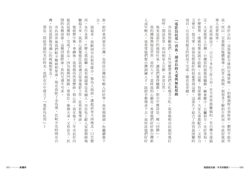 《我是胡志強,今天來報到!》是一部結合政治歷史、城市發展與個人哲學的深度訪談紀錄與傳記體書寫。全書從胡志強自外交轉入市政的心路歷程出發,深入探討他在台中市長任內的重大建設、政策理念與治理思維,並回顧他如何透過對文化、交通、建設、產業與城市品牌的深耕,將台中打造為宜居城市典範。