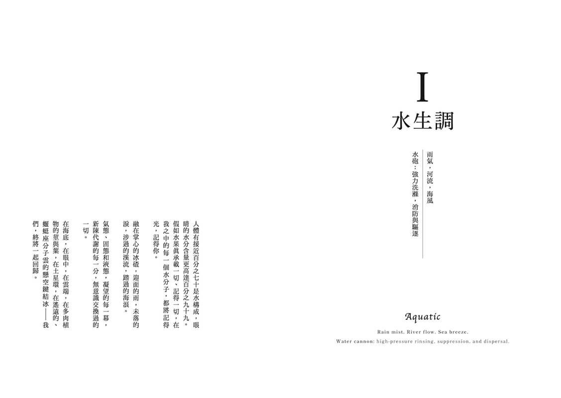 在詩集中,溫柔與殘酷、輕盈與沉重、冷冽與熱切、真實與夢境相互交織,如一場由香氣引領的深潛之旅。跟隨書中優雅、精準、乾淨而明晰的詩句,讀者將隨著不同香調的縈繞轉場,穿梭於長詩與短詩交錯的語場中,經歷那些曾經經歷過的傷痕與縫合、迴盪與醒覺。