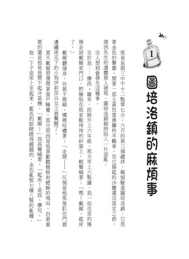 至於我──摩西.羅布,即將升上六年級。那天早上六點鐘,我一如往常的慢慢走到戴爾家門口,把臉貼在他家鬆垮垮的紗窗上,輕聲喊著:「嘿!戴爾,起床了。」