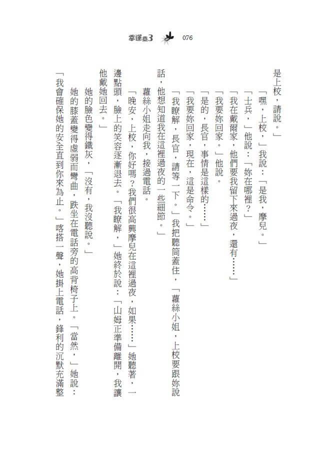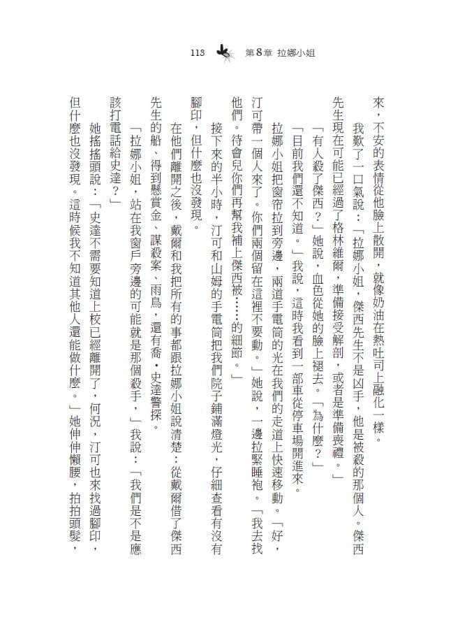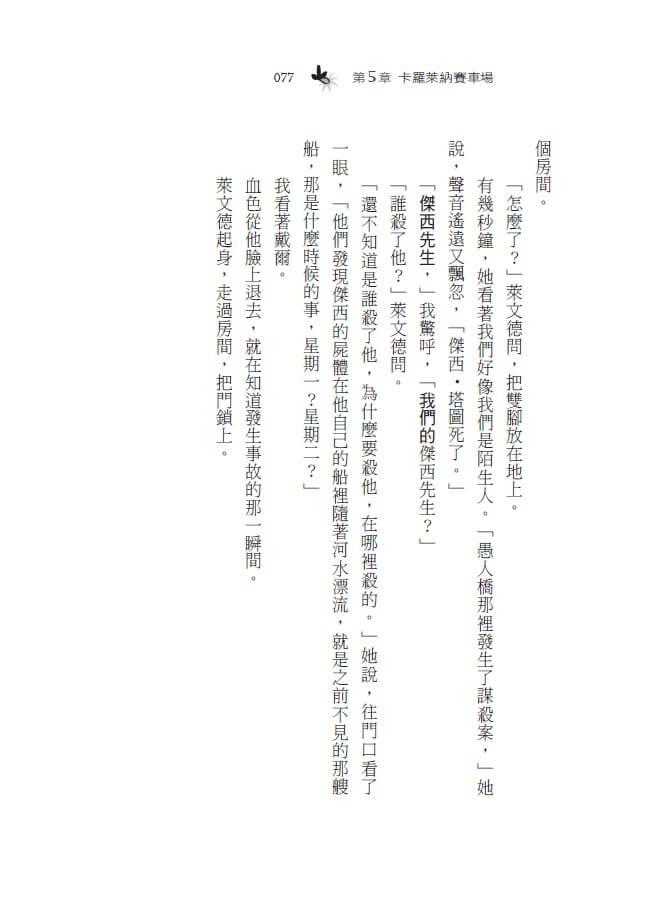 「是可麗餅,」我說:「那是法文。她也不行,上校前腳剛踏進門,拉娜小姐後腳就出門了。她也不在。」
