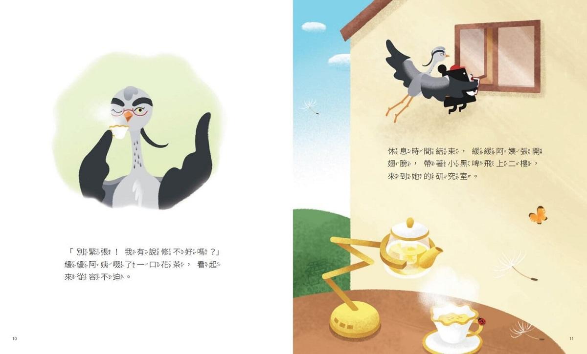 休息時間結束,緩緩阿姨張開翅膀,帶小黑啤飛上二樓,來到阿姨的研究室。