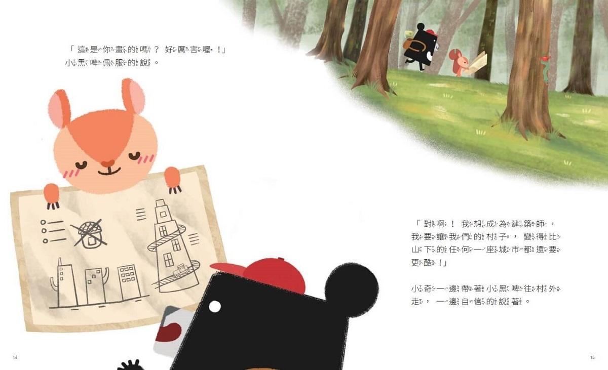 小黑啤按照小奇的指示,變出了遊樂園、學校、百貨公司、醫院、各種高樓大廈。不只設計圖裡的房子,他們把書裡看過的東西、腦袋裡想的東西通通都變出來了!