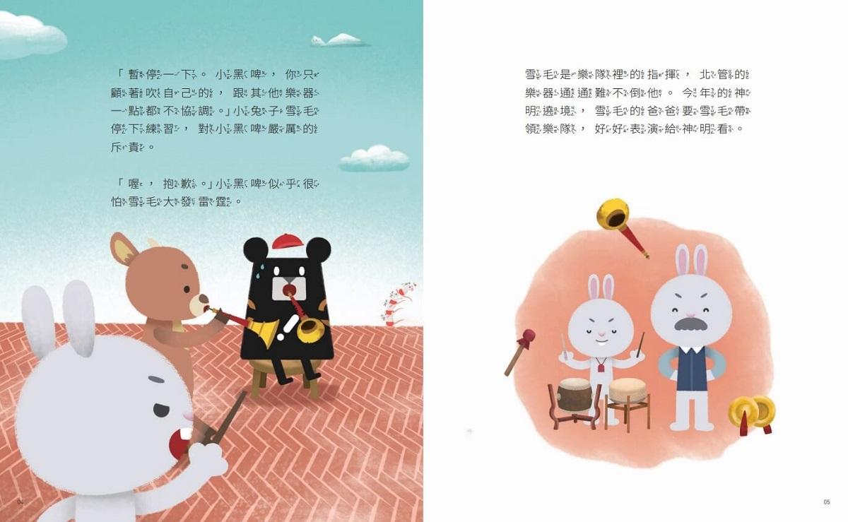 這次寒假,小黑啤參加了北管樂隊,他努力練習為兩週後的遶境活動做準備。小兔子雪毛是樂隊指揮,為了好好帶領樂隊並達到爸爸的期望,在練習的過程中,雪毛不但嚴厲指責團員,也和團員們發生爭執,氣氛變得越來越緊張。雪毛和團員之間發生了什麼誤會? 小黑啤要如何幫助樂隊度過危機呢? 邀請你跟著小黑啤,一起來面對!