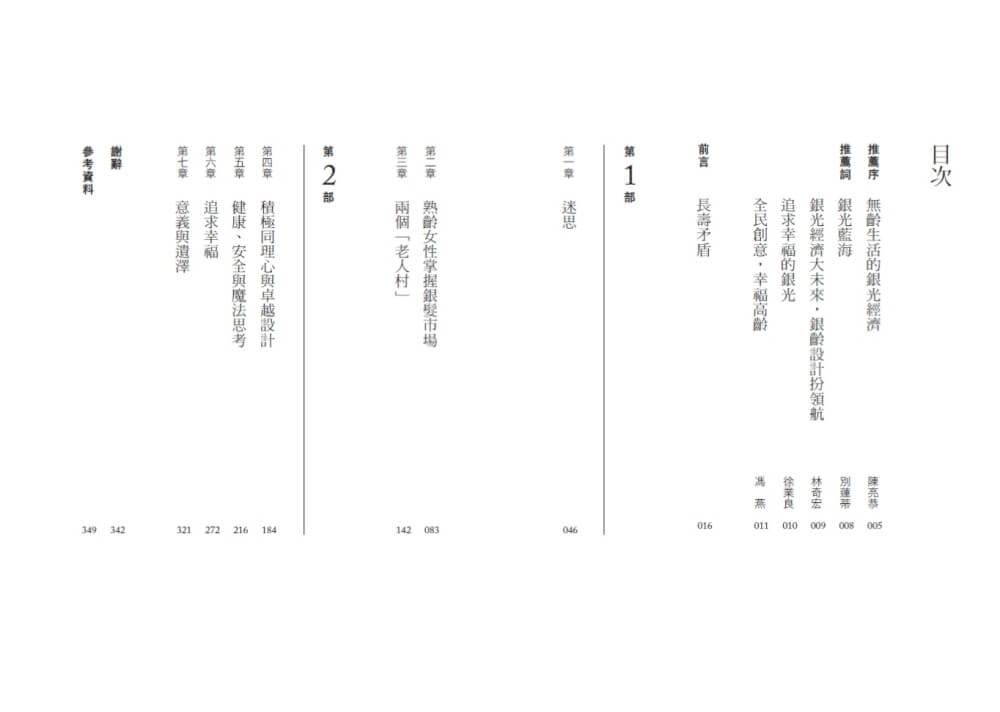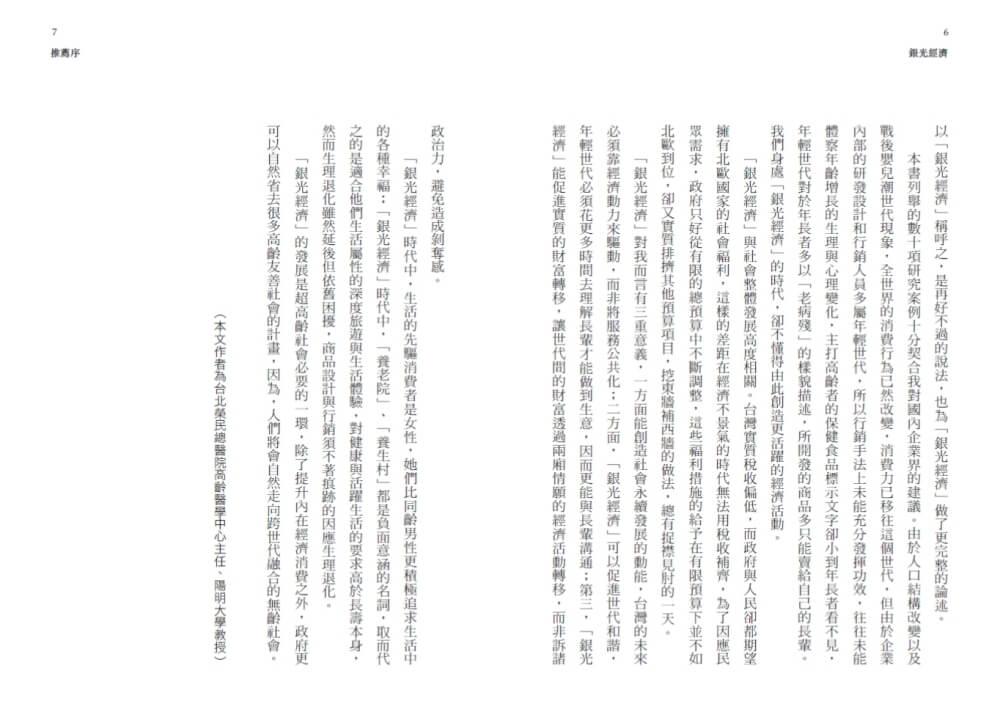 我非常積極正向看待人口趨勢。轉變,代表新的機會;如同《銀光經濟》一書告訴讀者:在高齡社會能夠洞燭機先的企業,就有機會在銀光經濟的發展中看見商機。──林奇宏(新北市政府衛生局局長)