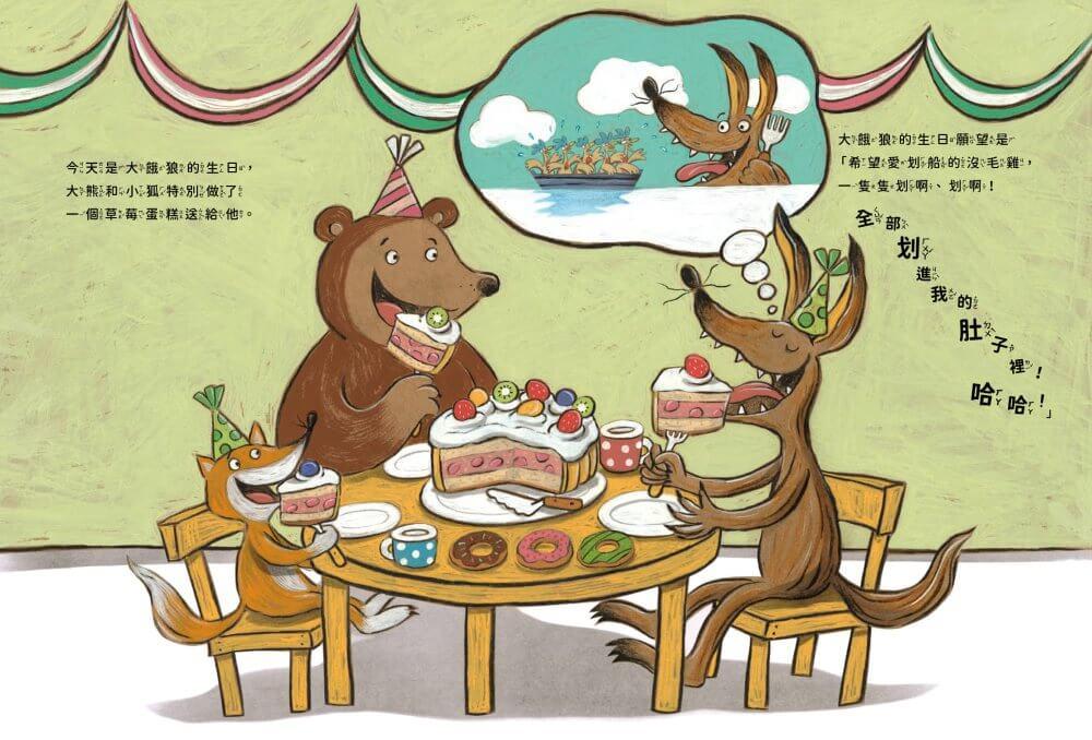 在大餓狼生日這一天,他許下心願:「我要吃沒毛雞大餐!」