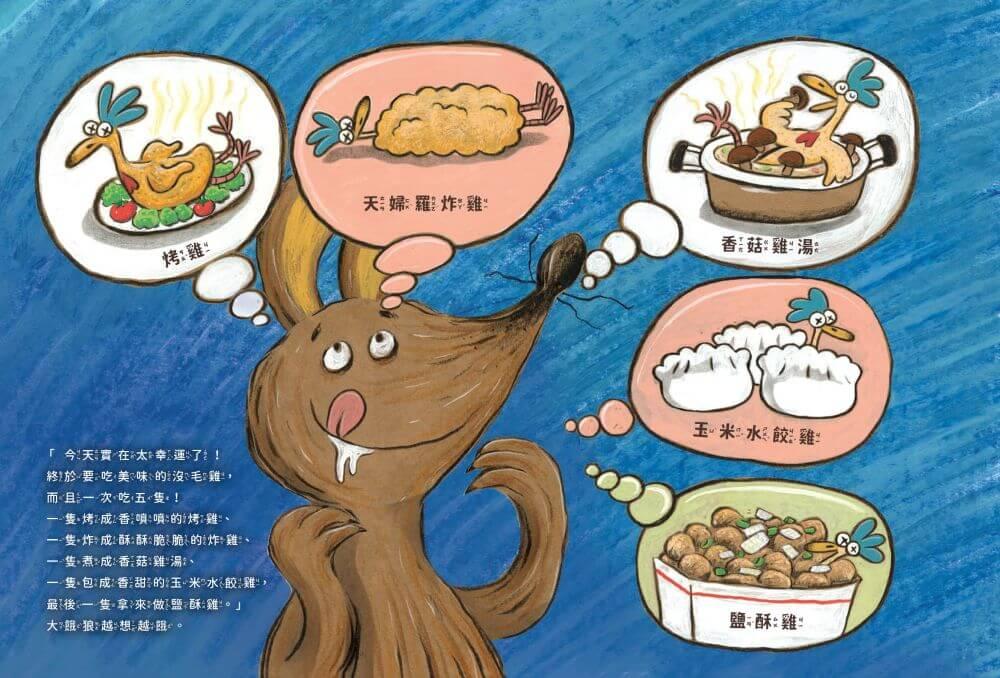 【沒毛雞】系列作品結合傳統的手繪技巧與多元媒材,部分背景以水墨渲染,加上各種紋路質感與古董紙張拼貼,創造新舊共存的風格。希望孩子們看到藏在大餓狼與沒毛雞幽默互動中的小溫暖,聽見簡單對白裡的小幽默,同時體驗畫面帶來的美好感受,如此微笑著聽完故事,一遍又一遍。