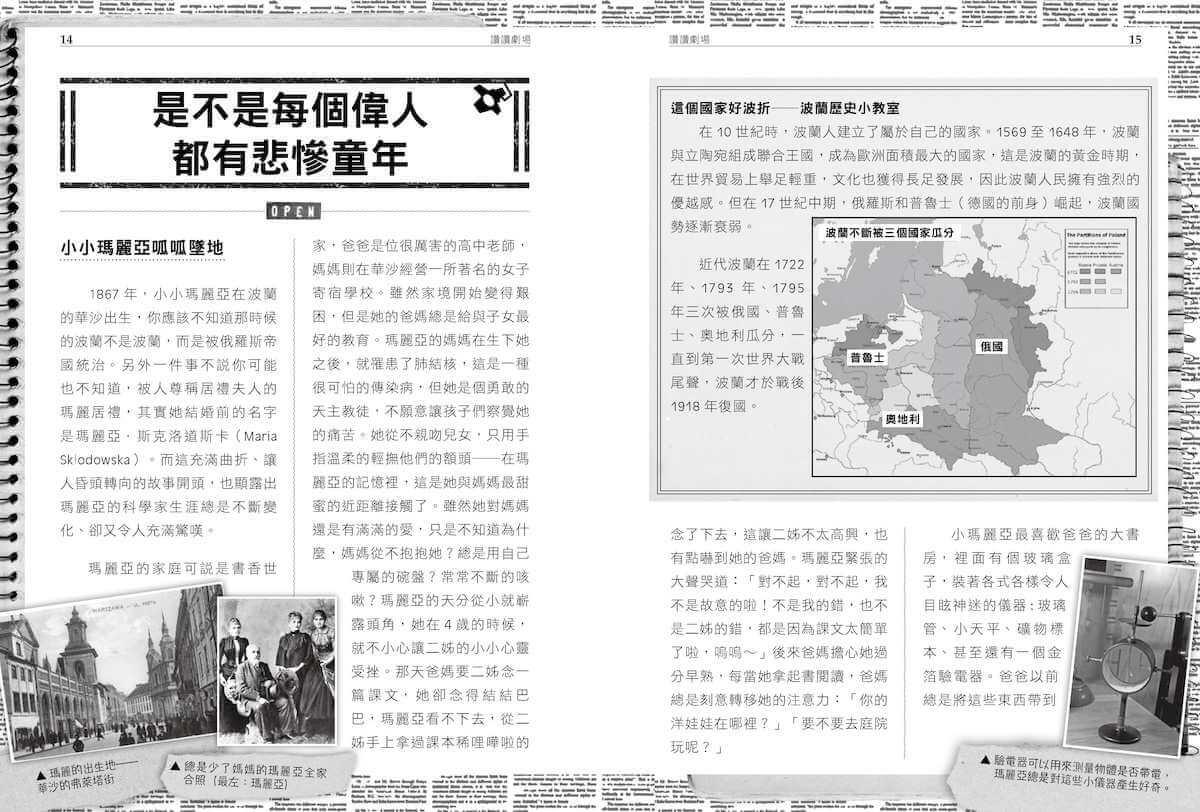 ►祕辛報報:放射科學史總整理,獨家居禮夫人研究祕訣大放送。不僅吸收知識,也向科學家學習獲取知識的方法,培養新世代超能力。還有獨家讀書祕訣與科學家大PK。不只直接吸收學科知識,也學會科學家如何閱讀、做研究的方法。培養學生自主學習、獨立解決問題的新世代能力。