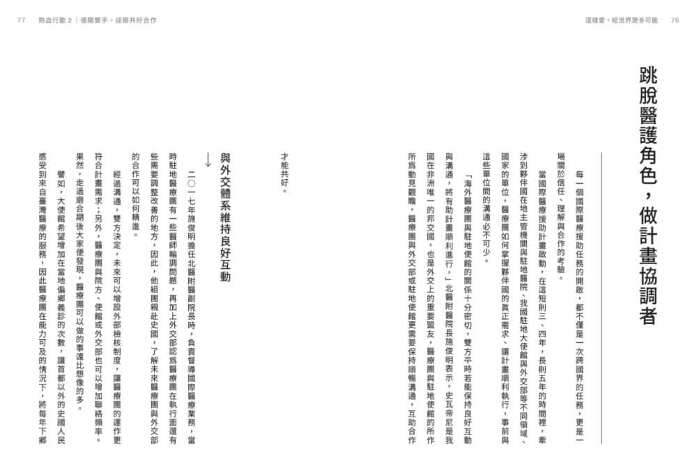本書即是這種互助共榮模式的具體體現。來自臺北醫學大學附設醫院的醫師、護理師等從業人員不辭千里,飛越數千甚至上萬公里,遠赴人生地不熟的友邦,用心傾聽當地深層需求,並運用自身所學專業,與在地政府、醫院、醫師、患者合作,不僅解決他們長期關切的健康問題,更幫助友邦建立自立自強自助之力。所謂「授人以魚,不如授人以漁」,正是如此。