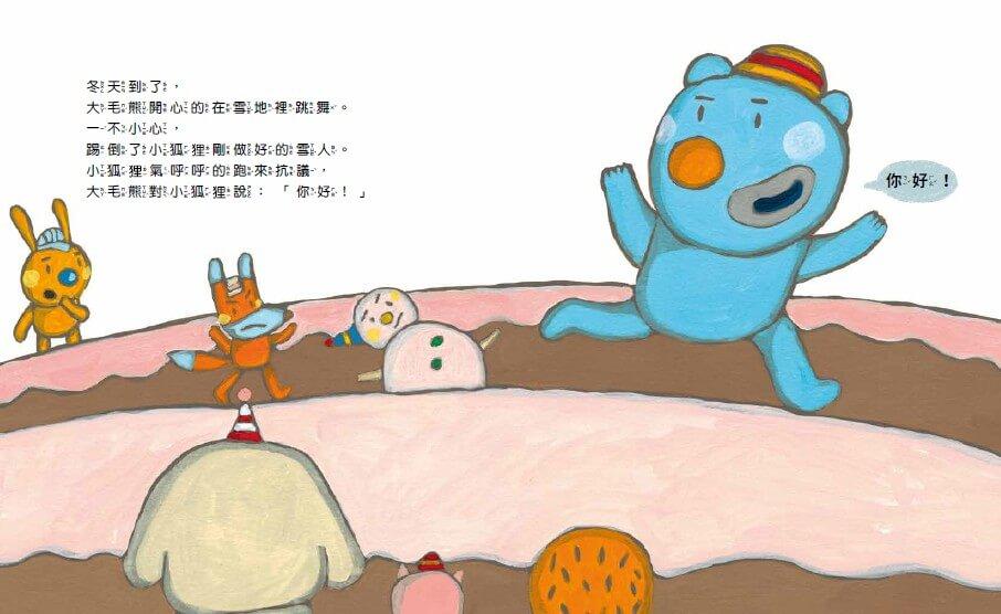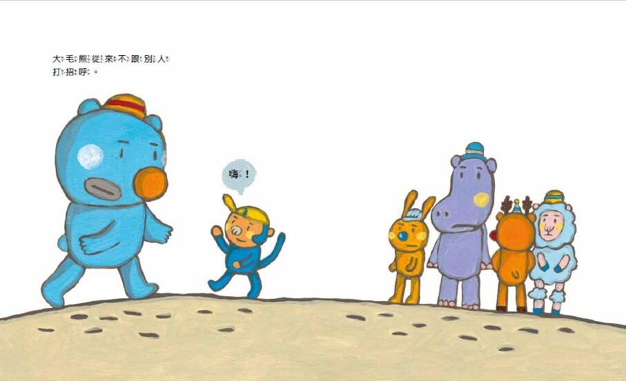 一開始,大毛熊不知道要說「你好」、「謝謝」和「對不起」,後來他開始勤奮的練習,樂此不疲!