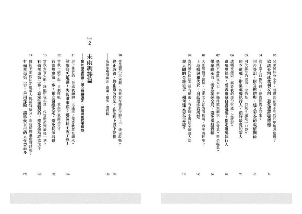 我始終認為家庭中的法律糾紛,雖然多半牽涉「情感」與「利益」的糾葛,但透過妥善周延的事前規劃,是可以有效降低,甚至避免的。尤其台灣當前的離婚率高居不下,且已步入「超高齡社會」,如何善用現有的法律制度,包括約定夫妻財產制、借名登記、人壽保險安排、預立遺囑及預定醫療決定、安養信託、意定監護等,為自己與家人預作安排,是每個人都該正視的課題。