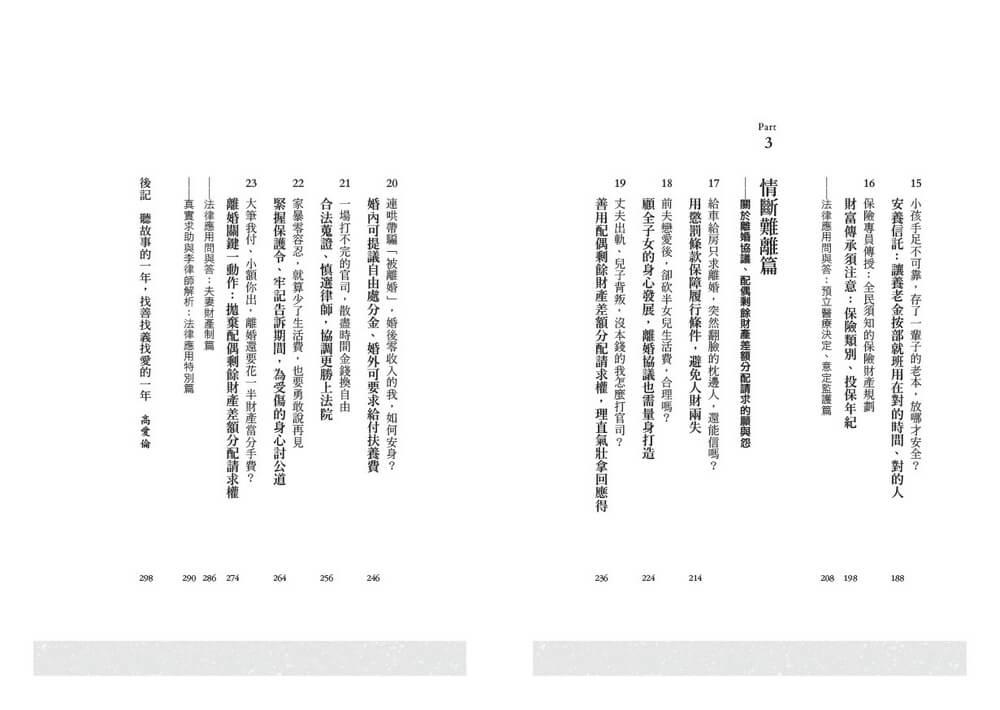 沒有人在結婚當下就體認到未來可能會離婚,並做好相關準備。即使現在的感情再好,你永遠都要有隨時可能離婚的認知。婚姻時常在不知不覺中,削減一個人的風險意識、獨立生活及全方位活好的能力。不履行離婚協議的狀況並不罕見,別忘了約定「懲罰性違約金」,還有和平協儀離婚未滿兩年,卻倒打一耙的「夫妻剩餘財產差額分配請求權」,離婚已經夠折磨人了!透過本書提早具備法律素養,尤其在必要時,能即早尋求專業、認真又用心的律師協助你走過極痛苦的這一程。