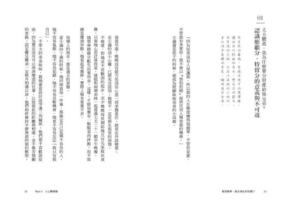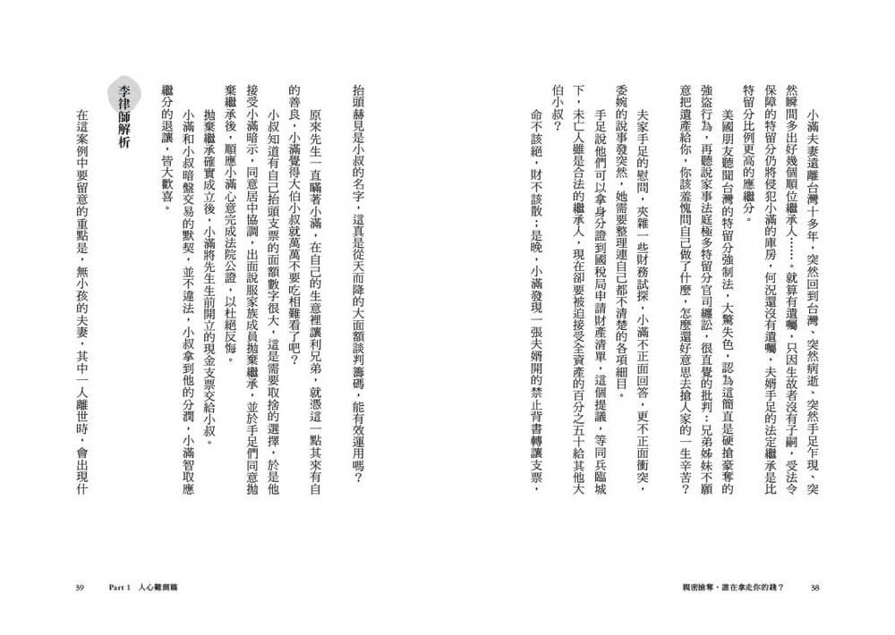 在我四十餘年的律師執業生涯裡,處理過各式各樣與家庭有關的法律紛爭,從企業大老闆的百億遺產風波,到尋常百姓家中剪不斷、理還亂的婚姻與繼承問題。不論身分地位如何,當婚姻、親情關係牽涉到金錢與法律時,其複雜程度往往出乎想像。