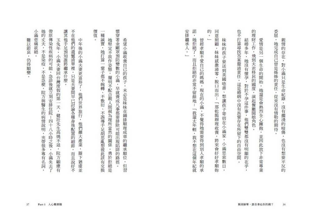 可是,無論是從新聞媒體所報導的豪門爭產,還是這本書裡,所描述的一般民眾如你我,可能陷入的親情迷思、親情陷阱,都在在說明了:如果你有一些法律的常識,如果你願意不嫌麻煩的,在健康時早做一些規劃,在身後不想你摯愛的人遭受親情變臉的損失,那麼「善用法律制度」,「為自己也為家人預作安排」,絕對才是「為了親情好」而最該做的事!