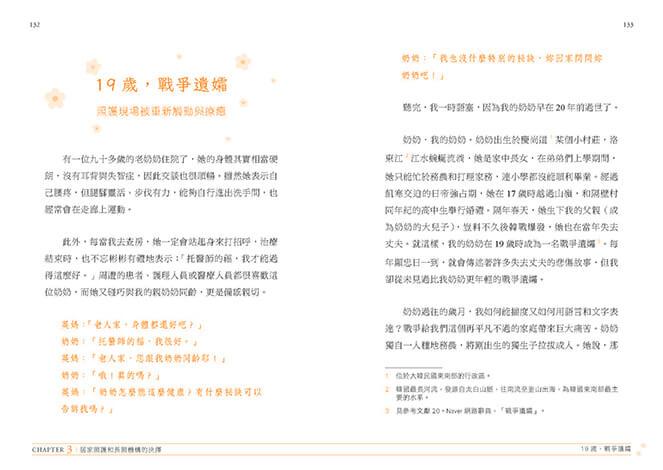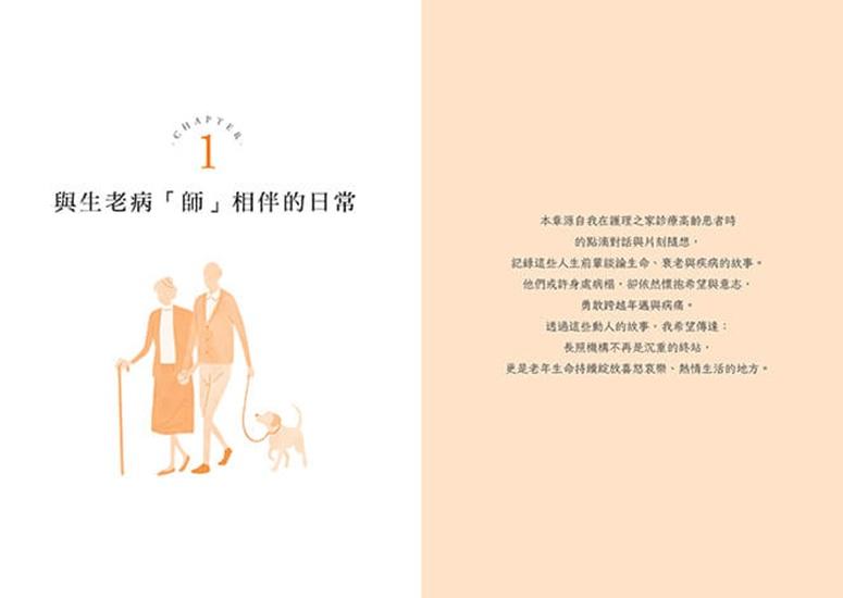 CHAPTER 1「與生老病『師』相伴的日常」,這部分日記,是根據我在護理之家為年長患者診療時的對話及簡短隨想。我記下這些人生前輩向年輕朋友訴說的有關生命、老邁及患病的教誨,希望透過他們跨越年老和病痛、對生命抱持希望和意志的美麗故事,告訴那些對長照機構投以抗拒和恐懼眼光的人們,長照機構也是許多人感受著喜怒哀樂、熱烈生活的空間。