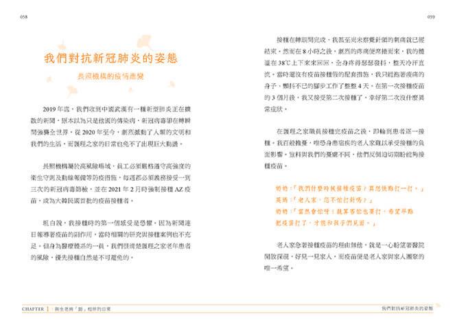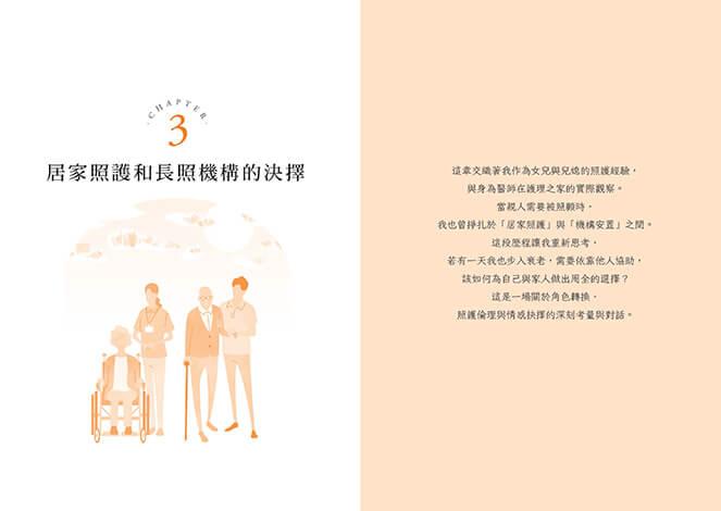 CHAPTER 3「居家照護與長照機構的抉擇」,記錄我身為一位女兒與兒媳的居家照護經歷,以及作為護理之家韓醫師在長照機構的經歷。「為了妥善照顧生病的父母,應該選擇居家照護還是長照機構?」本章包含我作為過來人與從業者的苦惱,以及關於將來自己垂垂老矣、需要他人協助時,該為自己和家人做出什麼樣的決定,在這當中的種種考量與糾結。