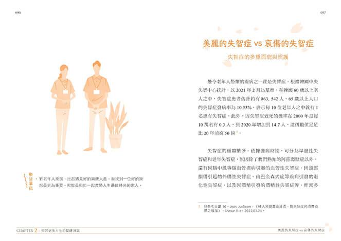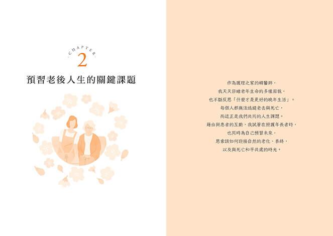 CHAPTER 2「預習老後人生的關鍵課題」,講述我在護理之家這個空間中,一邊看盡老年百態,一邊對「更好的晚年生活」作出的思考。每個人的人生皆充滿無常,唯一的共通點便是「人人都將迎向晚年並死去」,這也是無法迴避的事實。作為護理之家的韓醫師,我觀察這個社會在年邁生命的投影,透過親眼見到的生老病死,抱著為自己的晚年未雨綢繆的心態,去預習未來的時光。