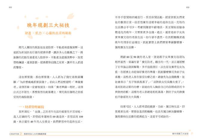 透過書中「生老病師」以自身生老病死講述的人生教誨,衷心盼望能為所有正準備迎向晚年生活的讀者們,提供些許的幫助。