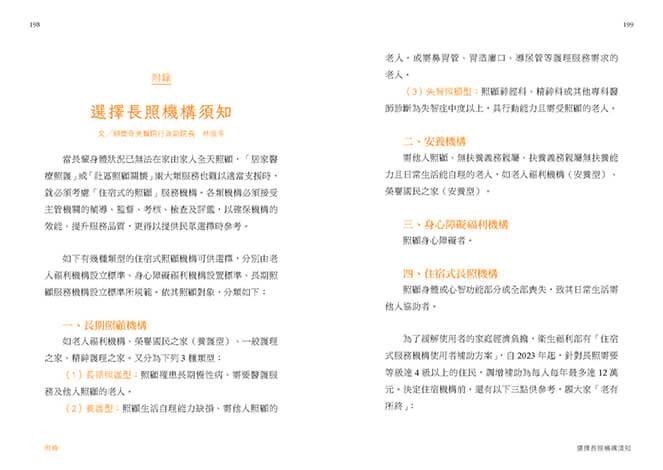 文末提供「選擇長照機構須知」,說明最適切的考量因素與機構類型,期盼大家有尊嚴地度過美麗開朗的「第三人生」!