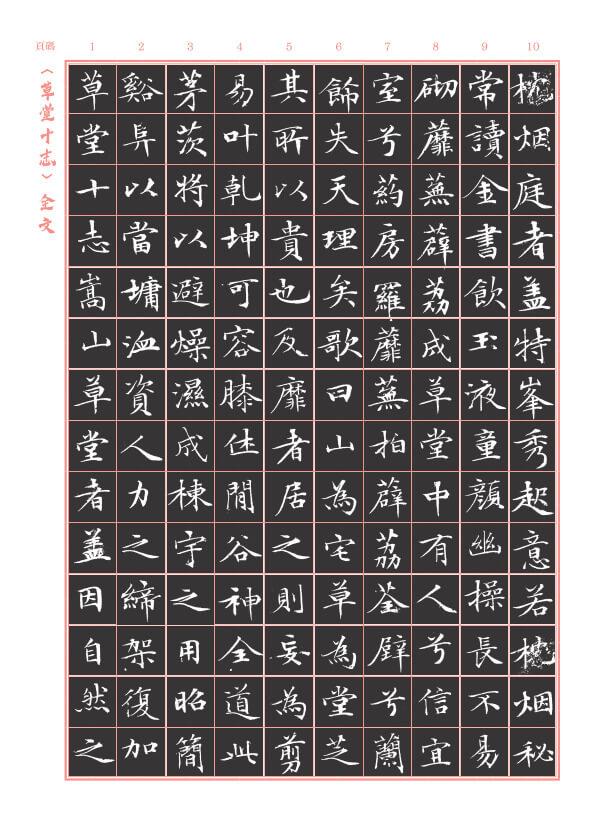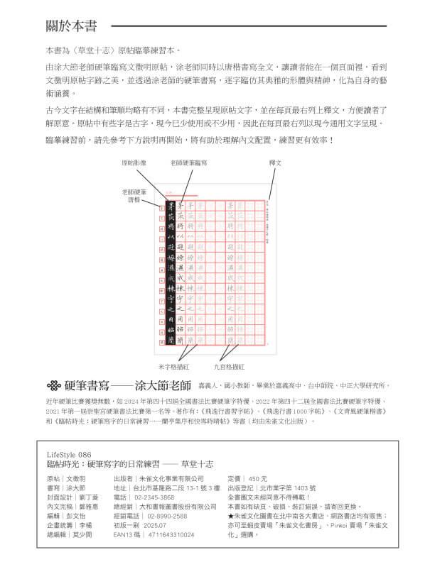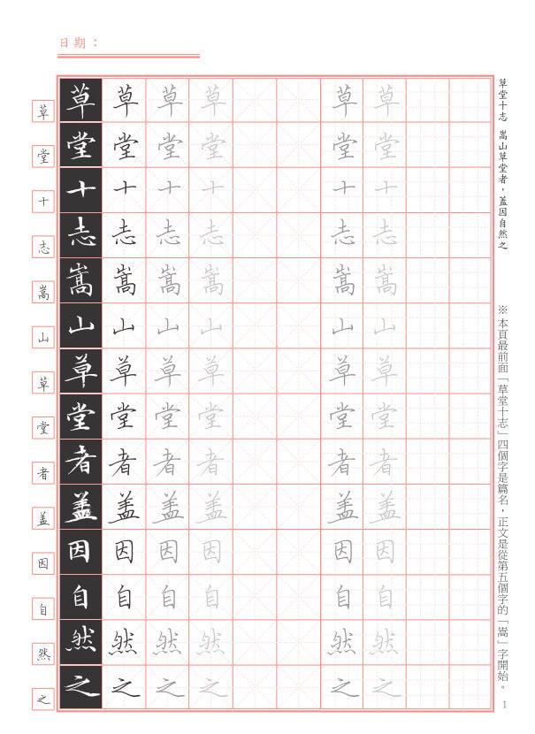 本書為〈草堂十志〉原帖臨摹練習本。是由涂大節老師硬筆臨寫文徵明原帖,並同時以唐楷書寫全文,讓讀者能在一個頁面裡,看到文徵明原帖字跡之美,並透過涂老師的硬筆書寫,逐字臨仿其典雅的形體與精神,化為自身的藝術涵養。