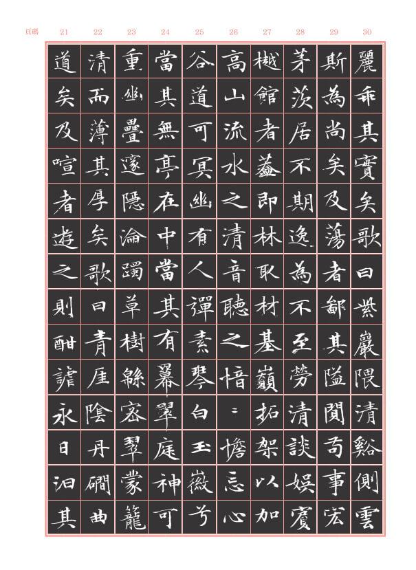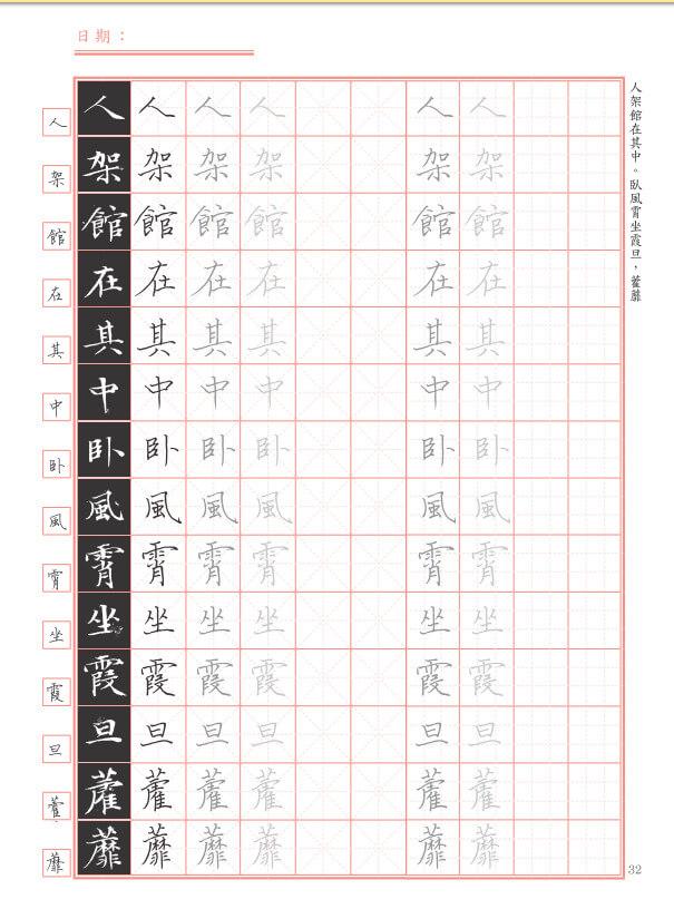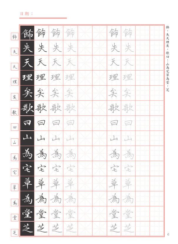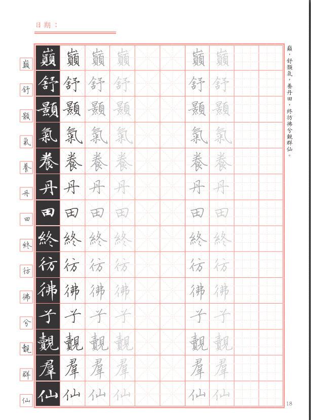 古今文字在結構和筆順均略有不同,本書完整呈現原帖文字,並在每頁最右列上釋文,方便讀者了解原意。原帖中有些字是古字,現今已少使用或不使用,因此在每頁最右列以現今通用文字呈現。