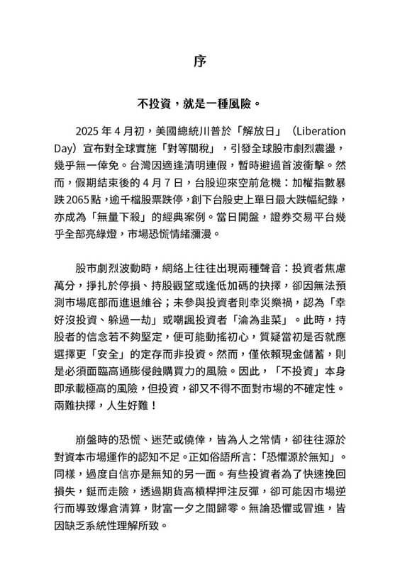 2025年4月,全球金融市場因美國總統川普於「解放日」宣布「對等關稅」而掀起驚濤駭浪,台股在清明連假後的4月7日更是迎來史上最慘烈的崩盤——加權指數暴跌2065點,逾千檔股票跌停,市場一片慘綠,恐慌情緒席捲投資人。這場「無量下殺」的危機,讓投資者陷入停損、持股觀望或抄底的兩難抉擇。