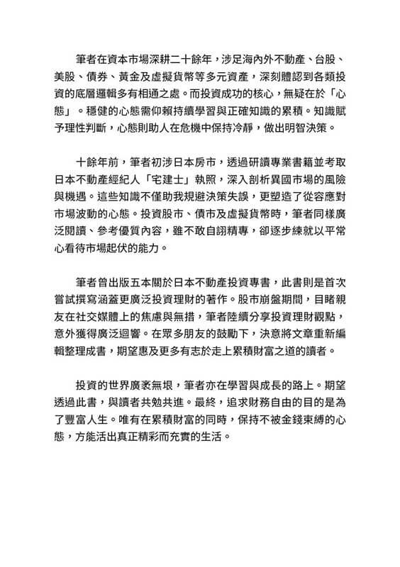 作者以二十餘年在資本市場的深耕經驗,涉足台股、美股、債券、海內外房地產、黃金及虛擬貨幣等多元資產,深入剖析投資的底層邏輯,強調「心態」與「知識」是財富累積的關鍵。投資成功的核心在於「心態」,而穩健的心態來自持續學習與正確「知識」的累積。書中分享了作者如何透過考取日本不動產經紀人「宅建士」執照,深入研究日本房市,成功規避風險並抓住機遇的經歷。這些知識與經驗不僅適用於房地產,更延伸至股市、債市等領域,讓作者練就以平常心面對市場波動的能力。