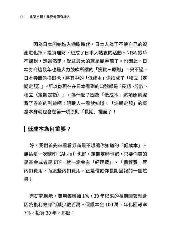 《韭菜逆襲!我要當個有錢人》以16堂課為架構,涵蓋投資理財的基礎知識與進階策略,幫助讀者從小資族起步,逐步邁向富裕階層。書中以輕鬆的語氣,從通膨的必然性到長期投資的複利效應,從崩盤時的應對策略到債券與房市的蹺蹺板效應,系統性地引導讀者建立穩健的投資思維,擺脫「貧窮腦」,實現財富自由。以下為本書亮點: