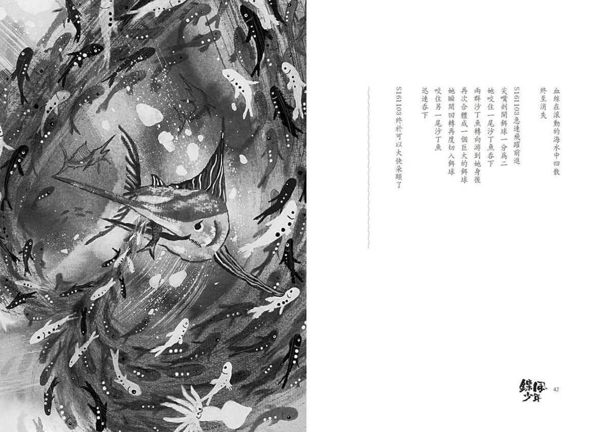 我的小說《鏢風少年》主角是一尾被研究人員編號為S161103的立翅旗魚,牠隨著季風而來,順著黑潮洄游,在臺灣東部海岸,遇見了鏢旗魚的達人老船長和他的叛逆孫子阿風,遇見了研究旗魚的阿全教授和他的學生阿鏢哥哥,遇見了牠生命裡不可思議的兩次抽離大海。
