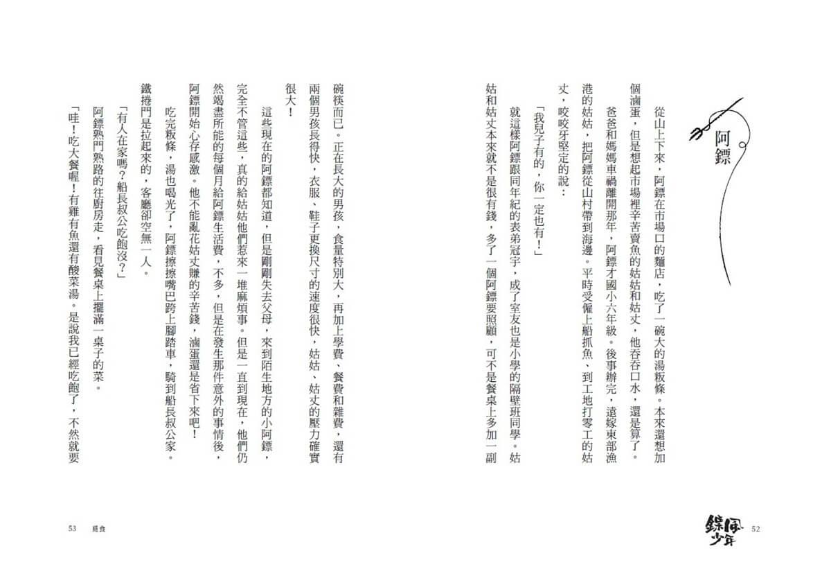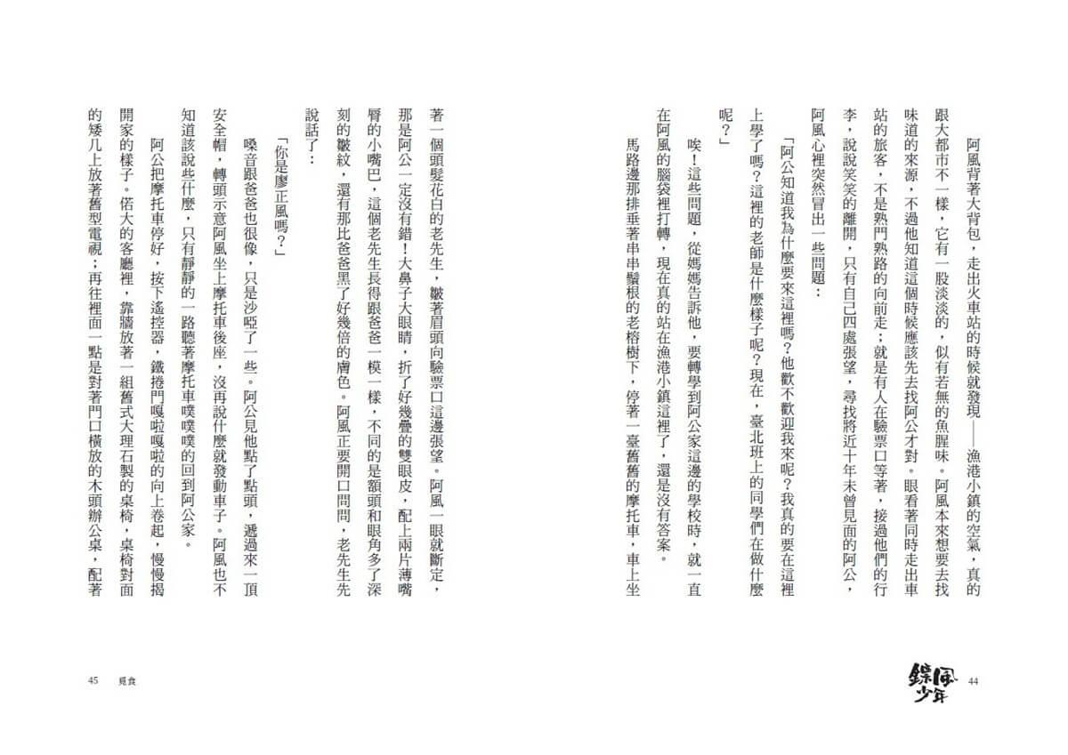 阿風看著長長的火車軌道,一直延伸到看不見的遠方,那兩條平行線就像爸爸和媽媽的想法,跟他的想法永遠不會有交集。他轉頭繼續和媽媽說:「老實說,我對火車票根上的那個地名,唯一的印象是一尾尖嘴巴的大魚,一尾躺在地上、很大很大的尖嘴巴的魚,其他的什麼都不記得了。」