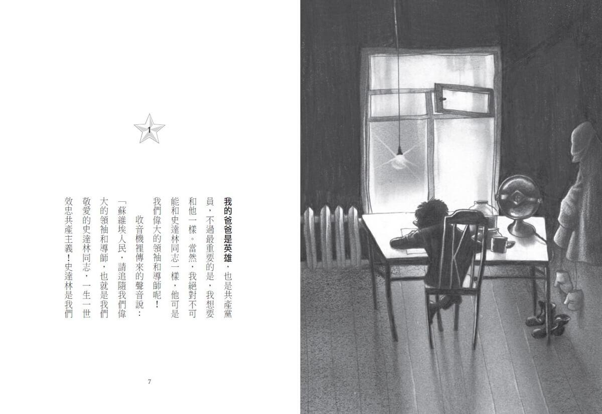 我們的鄰居瑪法.伊凡諾夫娜送給我一根胡蘿蔔,我帶著那根胡蘿蔔走到廚房的窗邊,爬上暖氣機,從那裡眺望庭院,看爸爸回來了沒有。有時候,他會到隔天早晨才回來,那是因為他在盧比揚卡廣場的國家安全局工作。國家安全局是我們的祕密警察,他們的工作就是負責揭露滲透到我們國家境內的敵人的醜陋面貌。爸爸是當中的佼佼者,史達林同志還曾經親手在他的胸前別上紅旗軍階勛章,稱讚他是「清除我們當中害群之馬的鐵掃帚。」