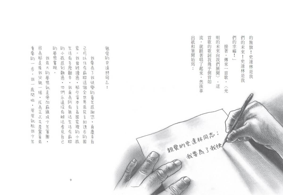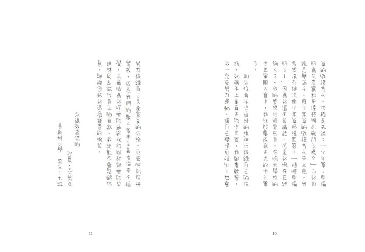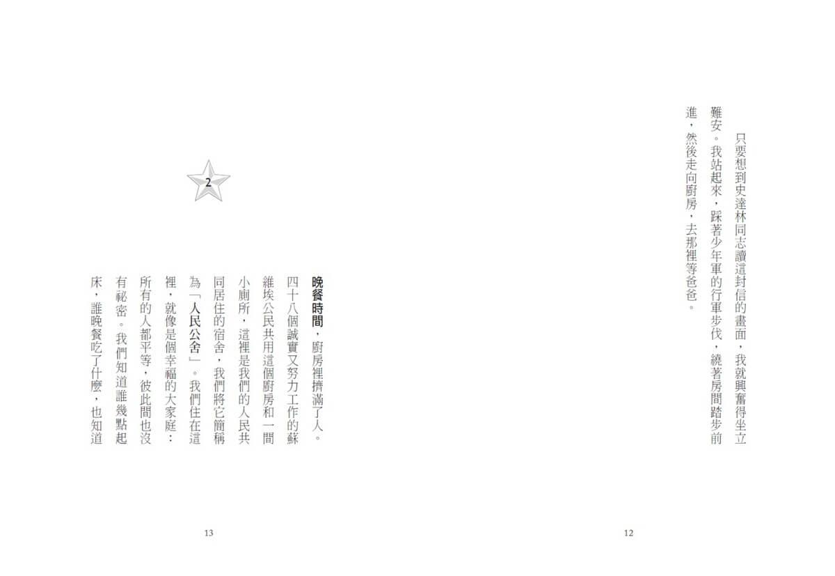 只要想到史達林同志讀這封信的畫面,就讓我興奮得坐立難安。我站起來,踩著少年軍的行軍步伐,繞著房間踏步前進,然後走向廚房,去等爸爸。