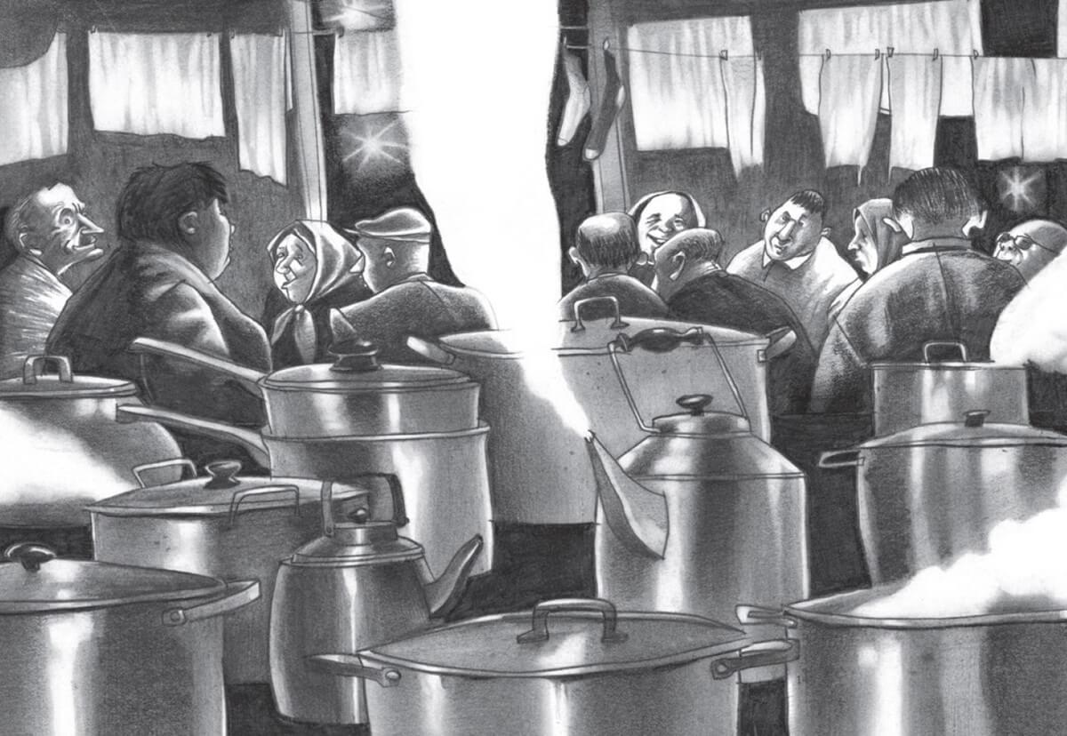 晚餐時間,廚房裡擠滿了人。四十八個誠實又努力工作的蘇維埃公民共用這個廚房和一間小廁所,這裡是我們的人民共同居住的宿舍,我們將它簡稱為「人民公舍」。我們住在這裡,就像是個幸福的大家庭:所有的人都平等,彼此間也沒有祕密。我們知道誰幾點起床,誰晚餐吃了什麼,也知道誰在他們的房間裡說了什麼話。隔間的牆壁很薄,有些牆壁還沒有連接到天花板,有個房間甚至只以陳列史達林相關書籍的書架做簡單隔間,讓兩家人一同居住。