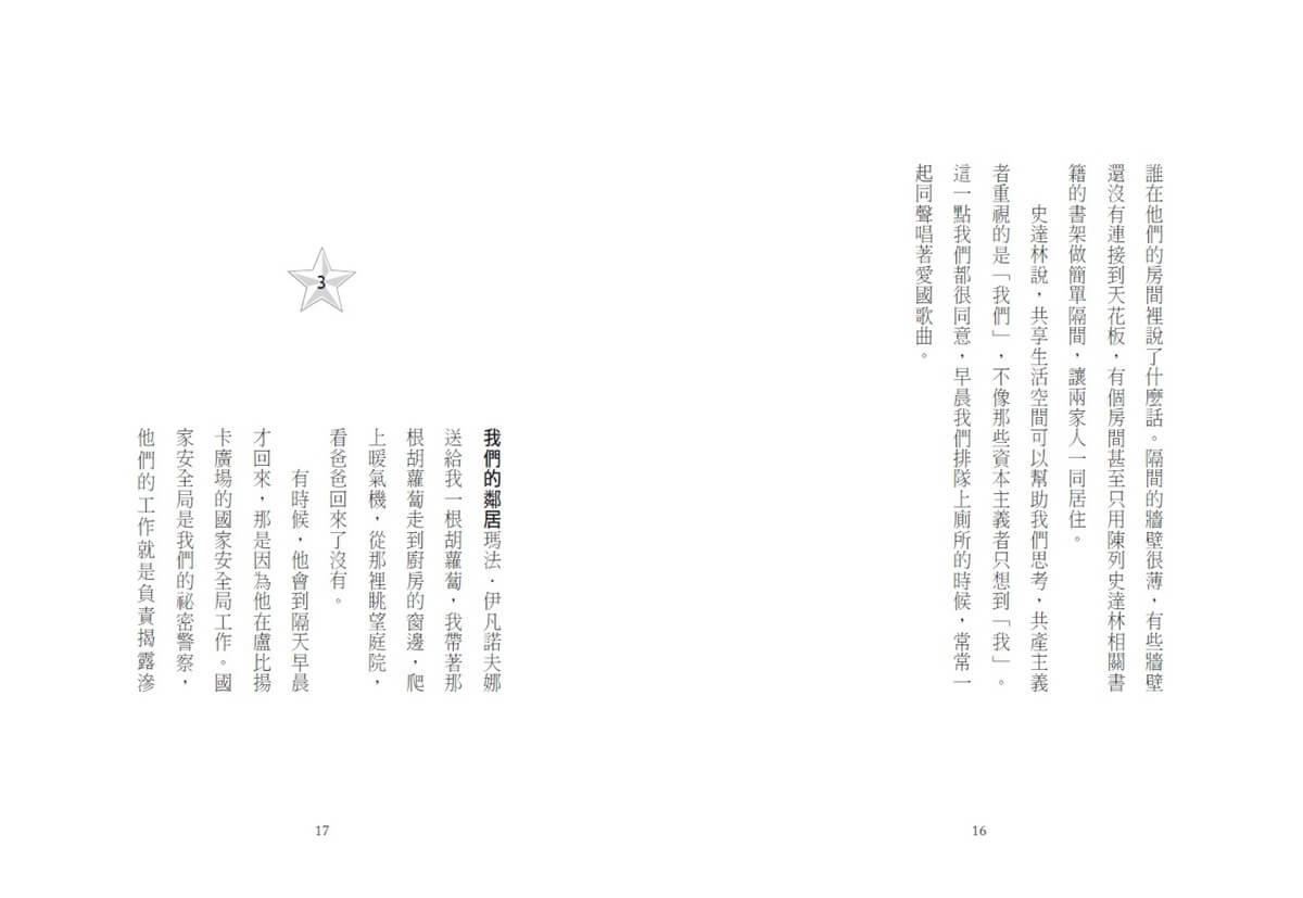 爸爸一走進來,廚房裡的每個人頓時都安靜下來。他們看起來有點害怕,但我知道,他們只是對爸爸充滿敬意而已。爸爸將我從暖器機上一把撈下來,抱著我穿越廚房,向每個人點點頭。他的外套質料很粗糙,而且聞起來有雪的味道。有一個名叫史塔克契夫的鄰居,跟著我們一路下到走廊,縮頭縮腦的笑著問爸爸今天又逮到幾個間諜。爸爸絕對不會告訴他,因為那是國家機密。不過就我所知,他每天都會抓到敵人。他曾經告訴我,要是我在街上看到行跡可疑的人就應該跟著他,仔細觀察他的一舉一動,他可能就是間諜。我們最好時時提高警覺,因為敵人無所不在。