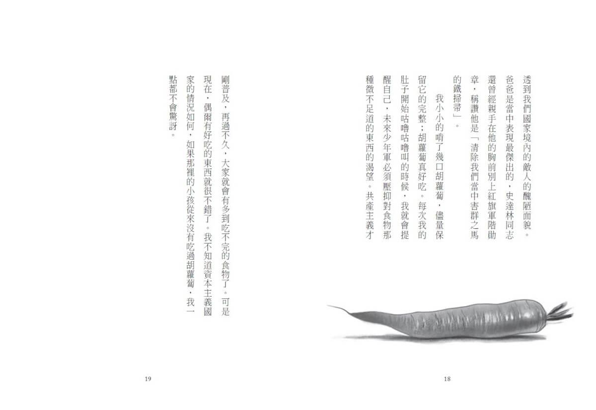 我小小的咬了幾口胡蘿蔔,儘量保留它的完整;胡蘿蔔真好吃。每次我的肚子開始咕嚕咕嚕叫時,就會提醒自己,未來少年軍必須壓抑對食物那種微不足道的東西的渴望。共產主義才剛普及,再過不久,大家就會有多到吃不完的食物了。可是現在,偶爾有好吃的東西就很不錯了。我不知道資本主義國家的情況如何,如果那裡的小孩從來沒有吃過胡蘿蔔,我一點都不會驚訝。