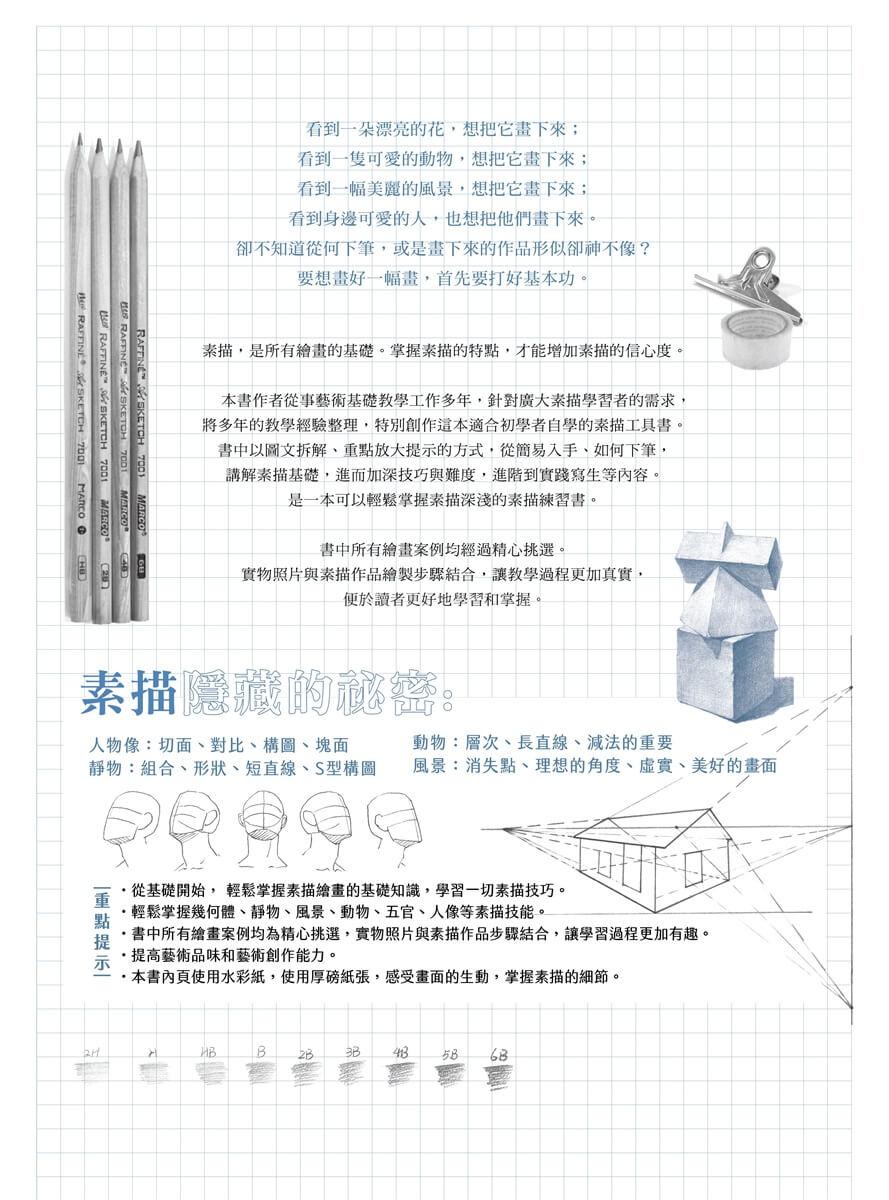 本書作者從事藝術基礎教學工作多年,針對廣大素描學習者的需求,將多年的教學經驗整理,特別創作這本適合初學者自學的素描工具書。書中以圖文拆解、重點放大提示的方式,從簡易入手、如何下筆,講解素描基礎,進而加深技巧與難度,進階到實踐寫生等內容。是一本可以輕鬆掌握素描從淺到深的素描練習書。