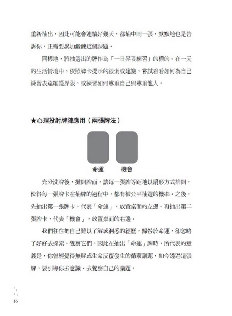 晨起抽一張,穩定一天的能量;睡前抽一張,反思一天的情緒界限;或心情混亂時抽牌,找到界限模糊的情境。透過牌卡的情境引導、金句提醒與練習,辨識出內在的壓力點與盲點,逐步建立一套「溫柔且堅定」的心理空間。