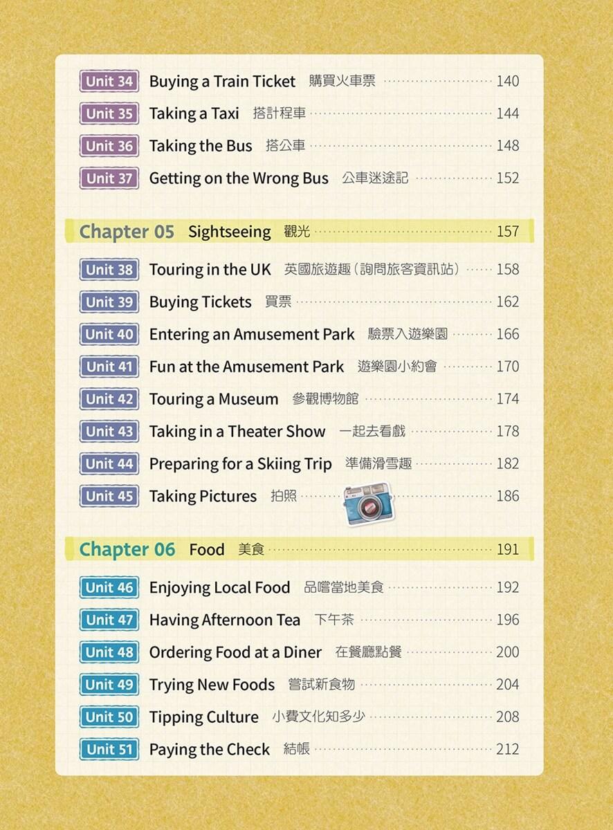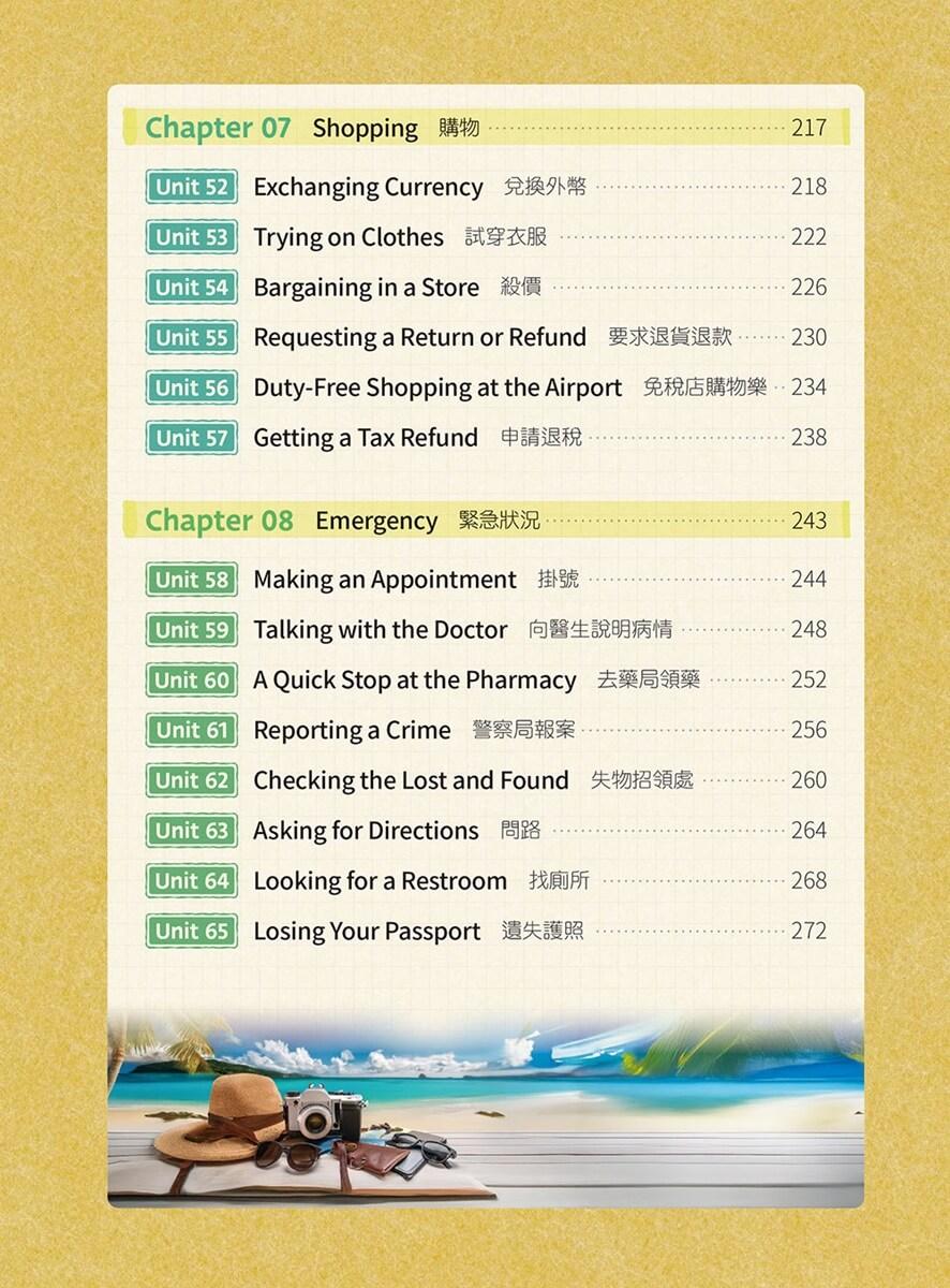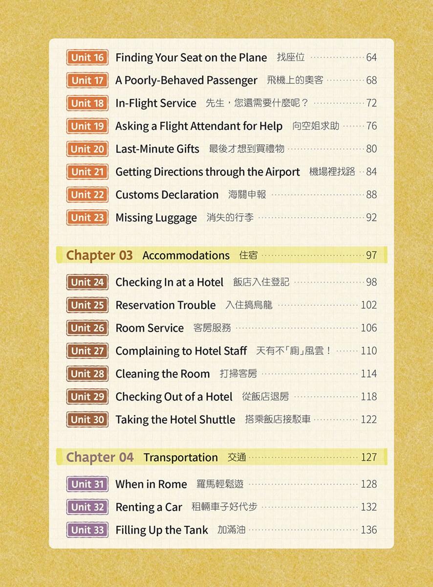 本書《旅遊英語這樣學最有效:65 個情境 × 真人示範 × 互動口說練習》正是為了這樣的需求而誕生。全書分為8大主題,共65個單元,從行前規劃、搭機、住宿、交通、觀光、美食到購物與緊急狀況,每一單元都根據真實情境設計,幫你一次掌握旅程中最常用的英語對話。