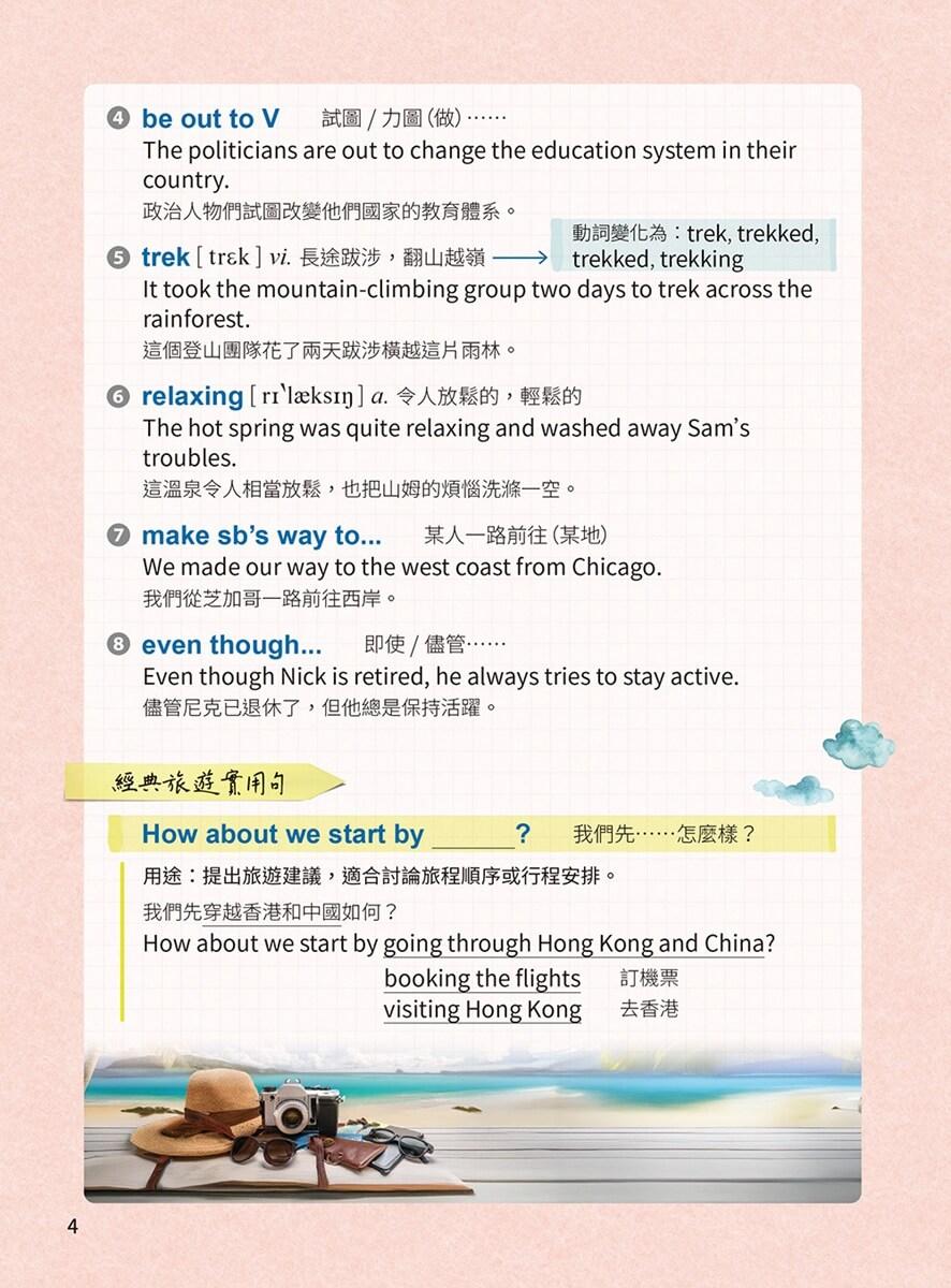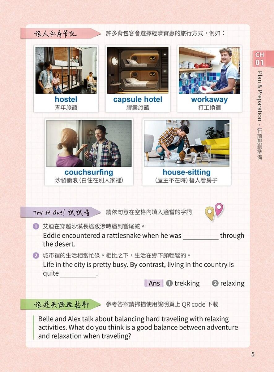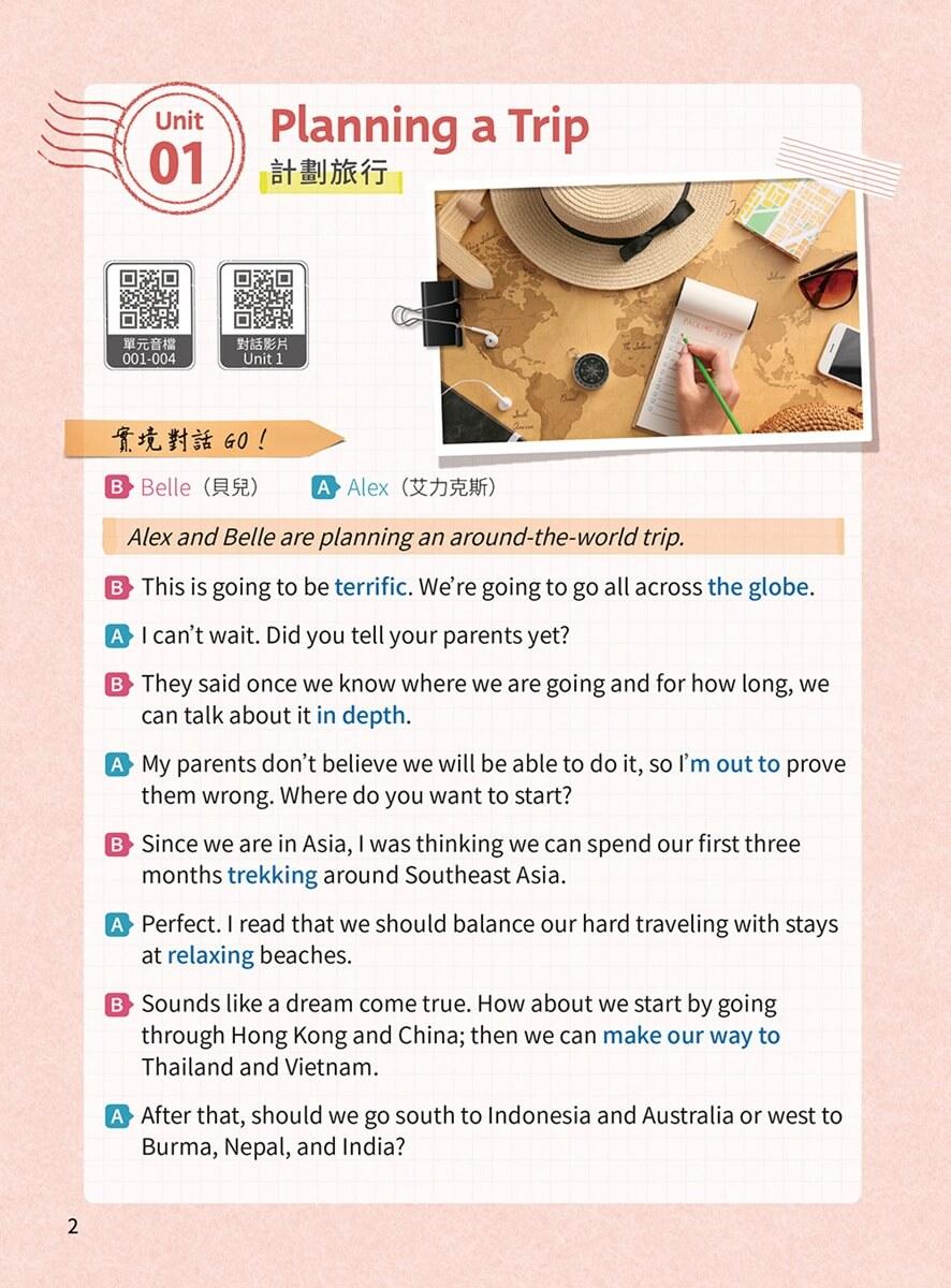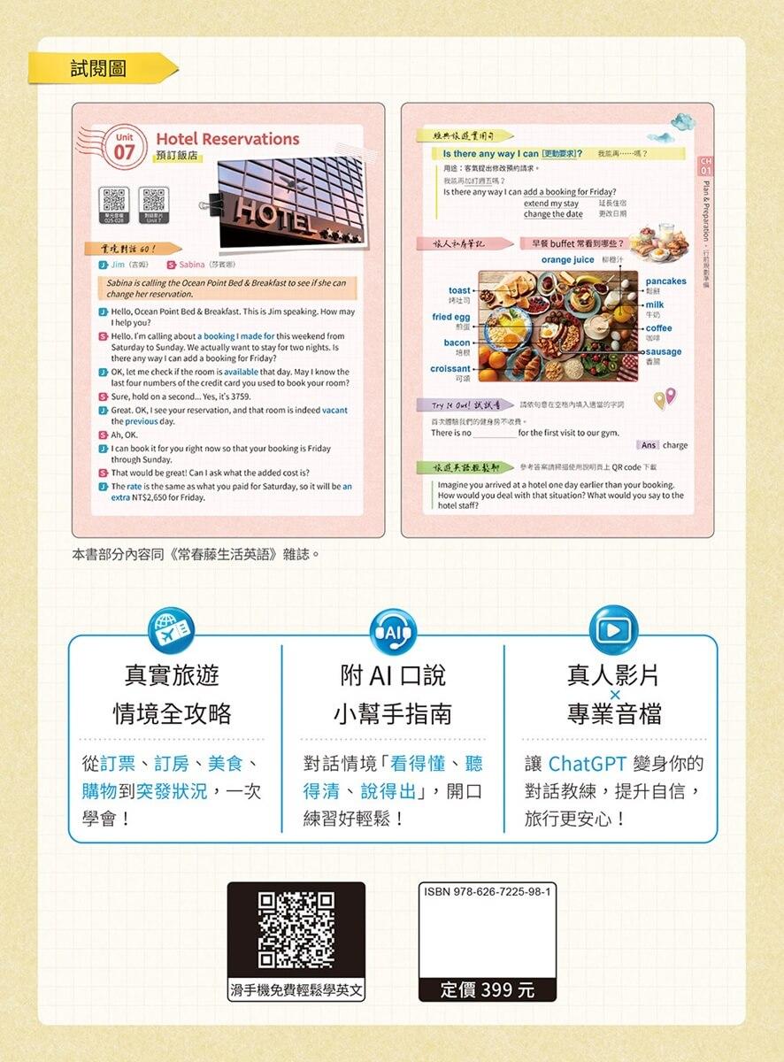 真實旅遊情境全攻略:從訂票、訂房、美食、購物到突發狀況,一次學會! 每一單元從對話開始,搭配單字片語、實用句型、旅人筆記與生活應用範例,幫你用「生活語感」快速學會怎麼開口說。