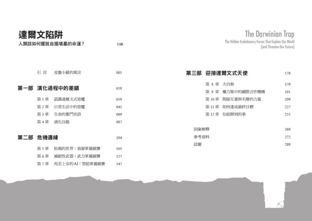 這本書分成三個部分。在第一部〈演化過程中的差錯〉,我會完整介紹達爾文式惡魔的概念。會探究達爾文式惡魔的起源,瞭解它們在日常生活中的蹤跡,以及它們在歷史中發揮的強大影響力。我還會解釋從古至今,「合作」為何會是排除這些惡魔的最佳方式。在第一部的最後,我將進一步推演達爾文式惡魔的理論,並且指出這個理論可以提出深具說服力的解釋,說明為何人類在宇宙中是孤獨的,以及這種顯而易見的巨大孤獨,或許能夠讓我們知道生命的本質是如此脆弱。