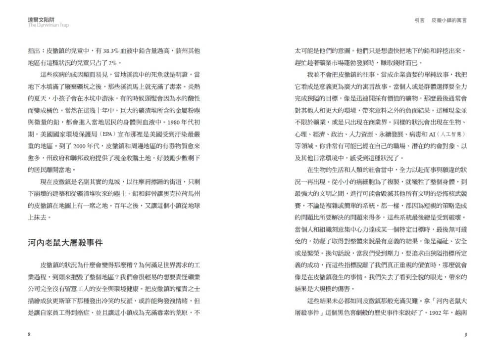 我並不會把皮徹鎮的往事,當成企業貪婪的單純故事,我把它看成是意義更為廣大的寓言故事。當個人或是群體選擇要全力完成狹隘的目標,像是迅速開採有價值的礦物,那麼最後通常會對其他人和更大的環境,帶來意料之外的負面結果。這種現象並不限於礦業,或是只出現在商業界。同樣的狀況會出現在生物、心理、經濟、政治、人力資源、永續發展、病毒和AI等領域中。你非常有可能已經在自己的職場、潛在的約會對象、以及其他日常環境中,感受到這種狀況了。