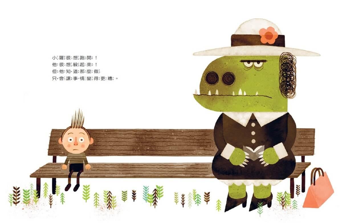 在創作技法上,布朗先用鉛筆、墨水、水彩、不透明水彩畫在紙張上,再以電腦數位處理、合成上色。簡潔的構圖、幾何的造形、復古的色彩,以及漫畫式的對話框,呈現這個讓孩子感同身受的故事。尤其是那個綠色怪獸老師的鮮明形象,相信每個孩子都能深切體會主角小羅的真實感受。