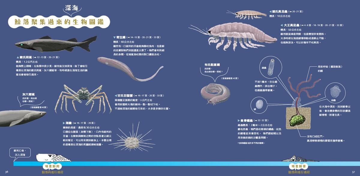 本書由日本繪本獎作家江口繪理、海洋生態畫家河崎俊一以及日本鯨落研究專家藤原義弘合作,從一頭抹香鯨死亡沉入深海後,歷經鯊魚、鰻魚來啃食魚肉,到甲殼類的蟹、海膽、具足蟲……來接力分食,最後還有食骨蠕蟲來當鯨骨的清道夫,把骨頭吃得一乾二淨,剩下空心的骨頭形成礁岩,提供生物庇護,過程大約經過100年。