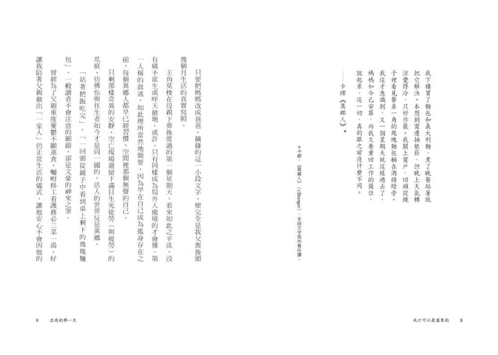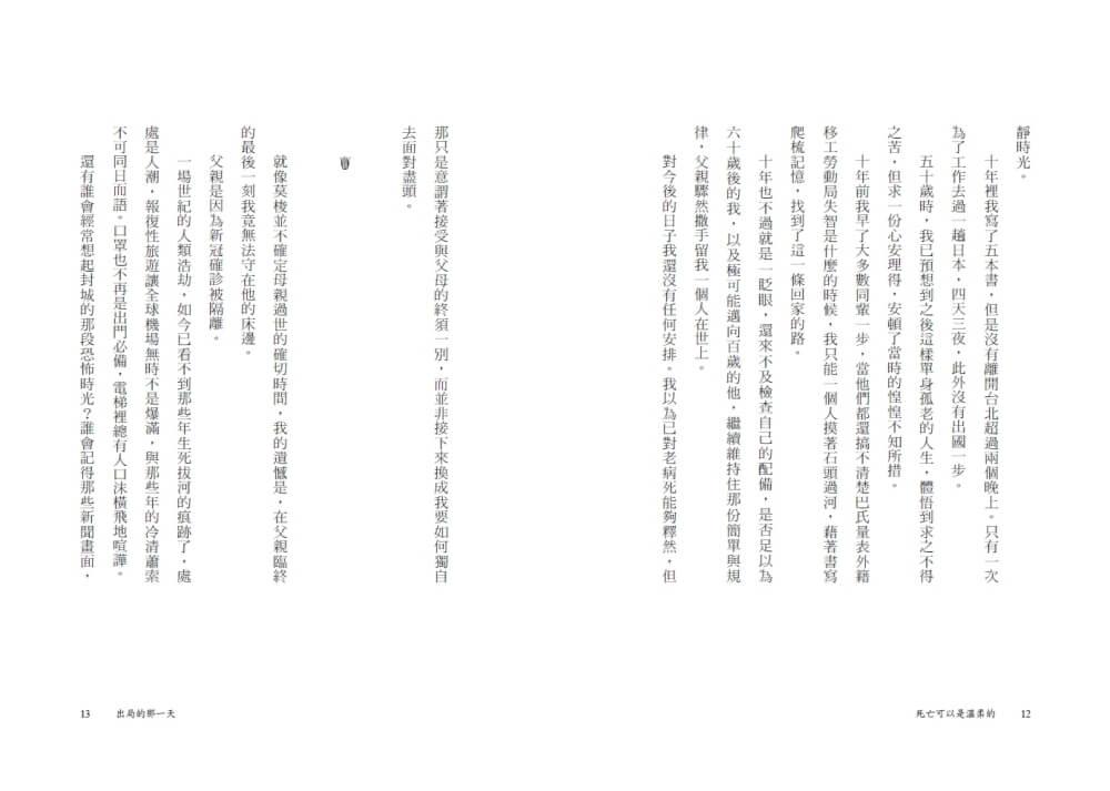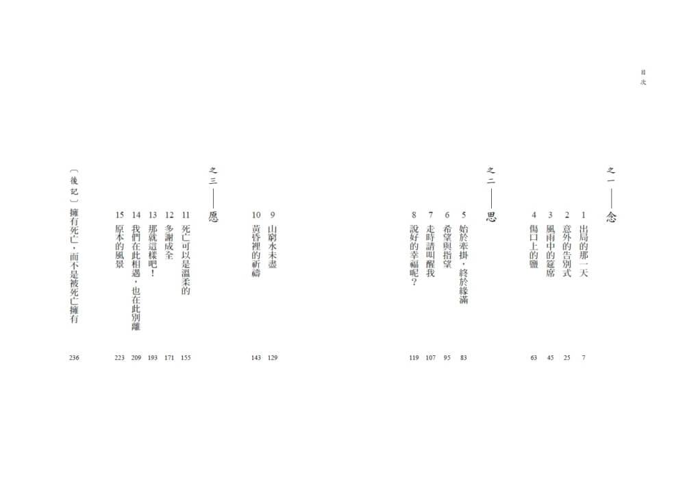 他沒有看到母親癌末奄奄一息的過程,記得的還是幾年前見面時健康的母親。如果說,沒有人會再記得自己的出生是件惆悵又悲傷的事,那麼兩次都做為父母臨終時身邊唯一的孩子,我只能說,也許我更接近如何排練自己的死亡。