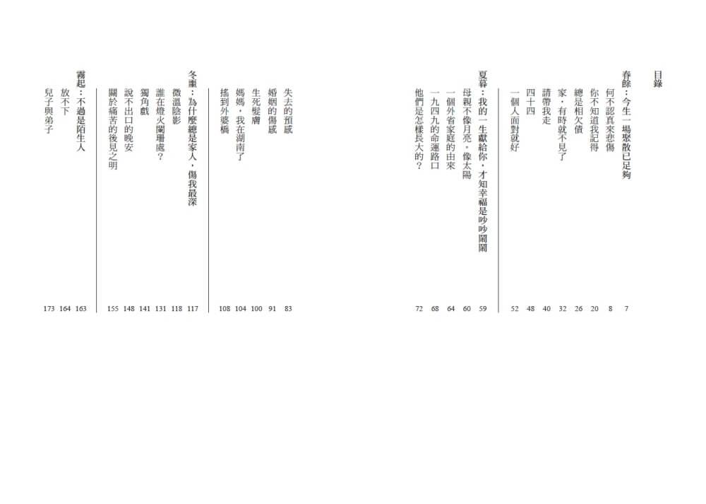 一週一篇,寫下了我在生命艱難轉折那一年裡的所思所想,同時新的生命變故繼續接二連三而來。我藉著書寫維持了我那段日子裡最底限的清醒,與現實搏擊,與過往和解。原以為這都是自說自話的私散文,每週竟有上萬讀者的點閱轉貼,我彷彿感覺到,原來我說出了太多人不敢說出口的心事。