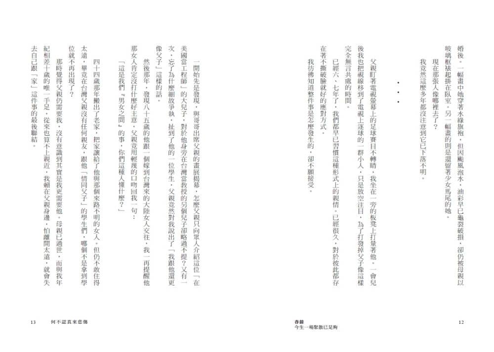 像中途被寫進連續劇裡的角色,我晚了十年加入了一個不快樂的家庭,卻對後來的劇情發展,完全無能為力。如今,母親與哥哥都走了,父親老弱了,只剩下我還在努力拼湊著,許多仍然斷裂的劇情。我從沒期望過成家,因為光是這一個家,就已經留給我太多這一生都逃離不出的陰影。
