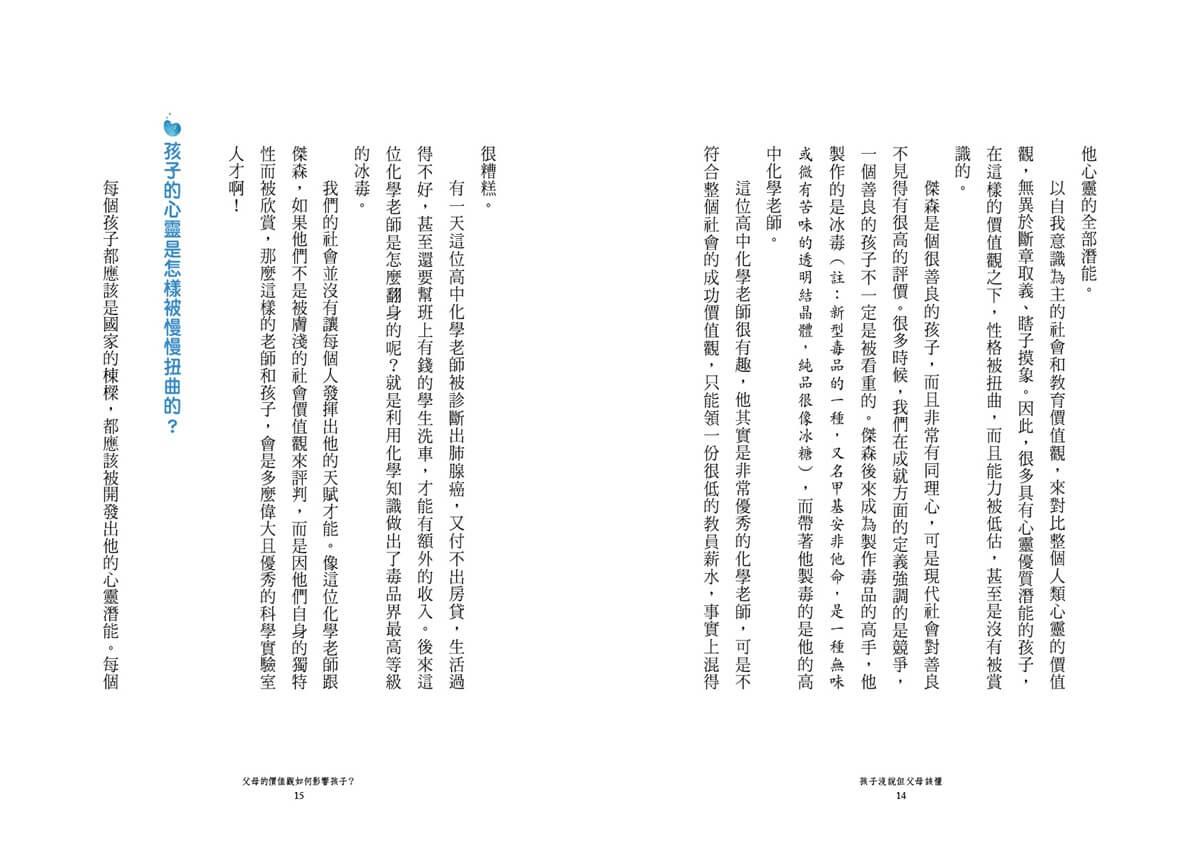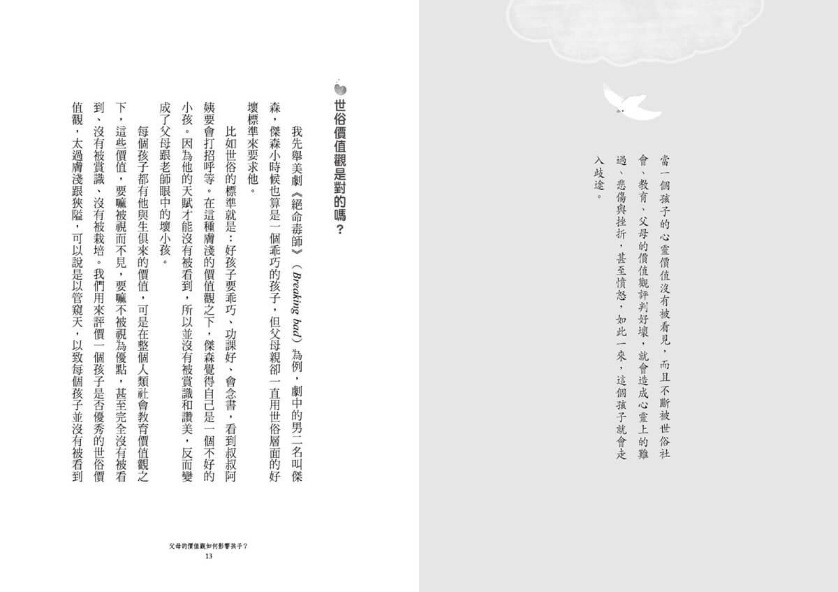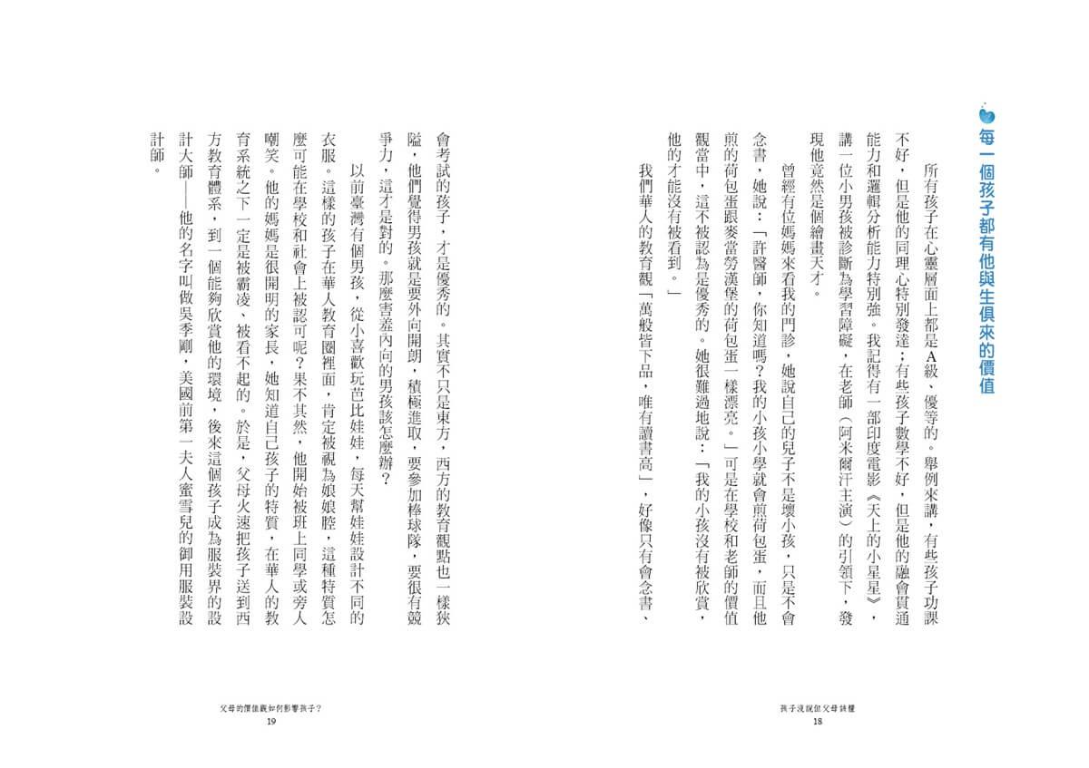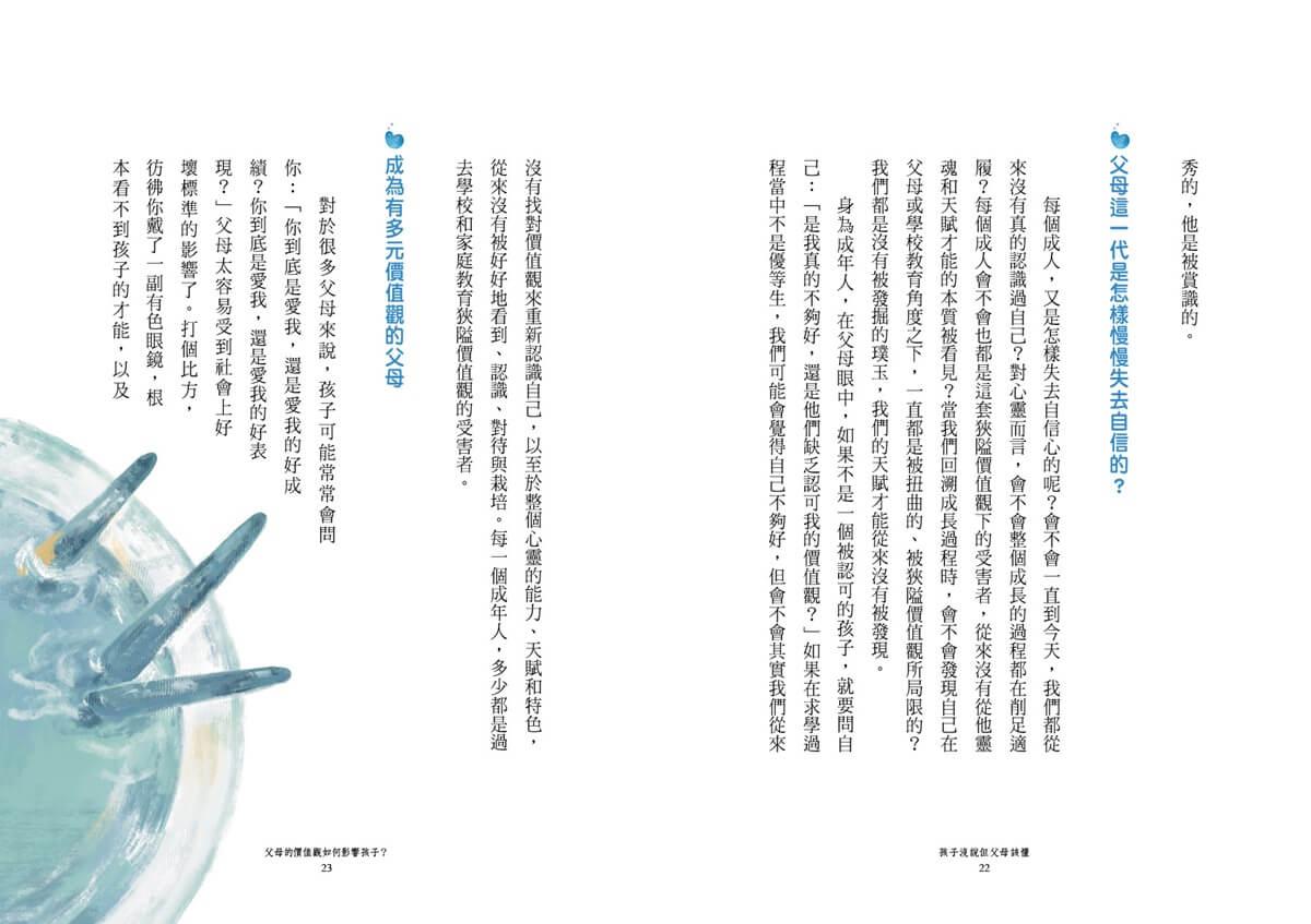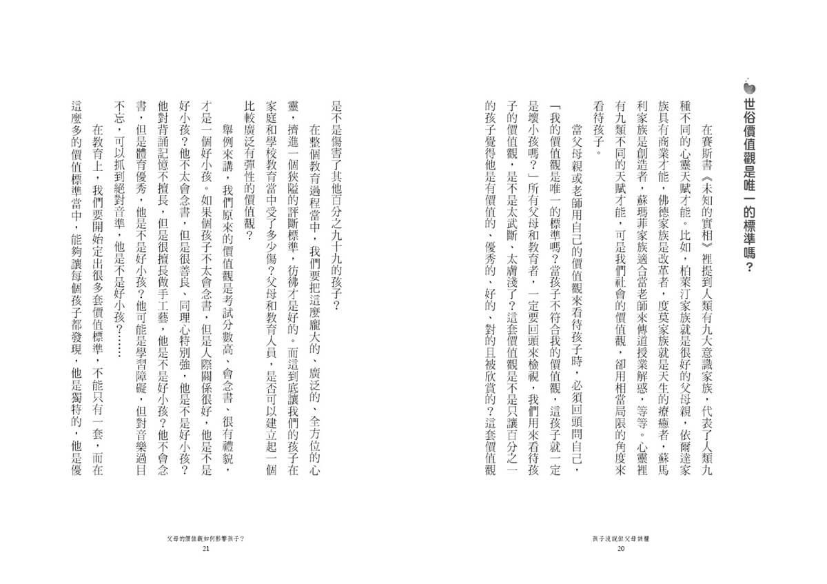 當父母親或老師用自己的價值觀來看待孩子時,必須回頭問自己,「我的價值觀是唯一的標準嗎?當孩子不符合我的價值觀,這孩子就一定是壞小孩嗎?」所有父母和教育者,一定要回頭來檢視,我們用來看待孩子的價值觀,是不是太武斷、太膚淺了?這套價值觀是不是只讓百分之一的孩子覺得他是有價值的、優秀的、好的、對的且被欣賞的?這套價值觀是不是傷害了其他百分之九十九的孩子?
