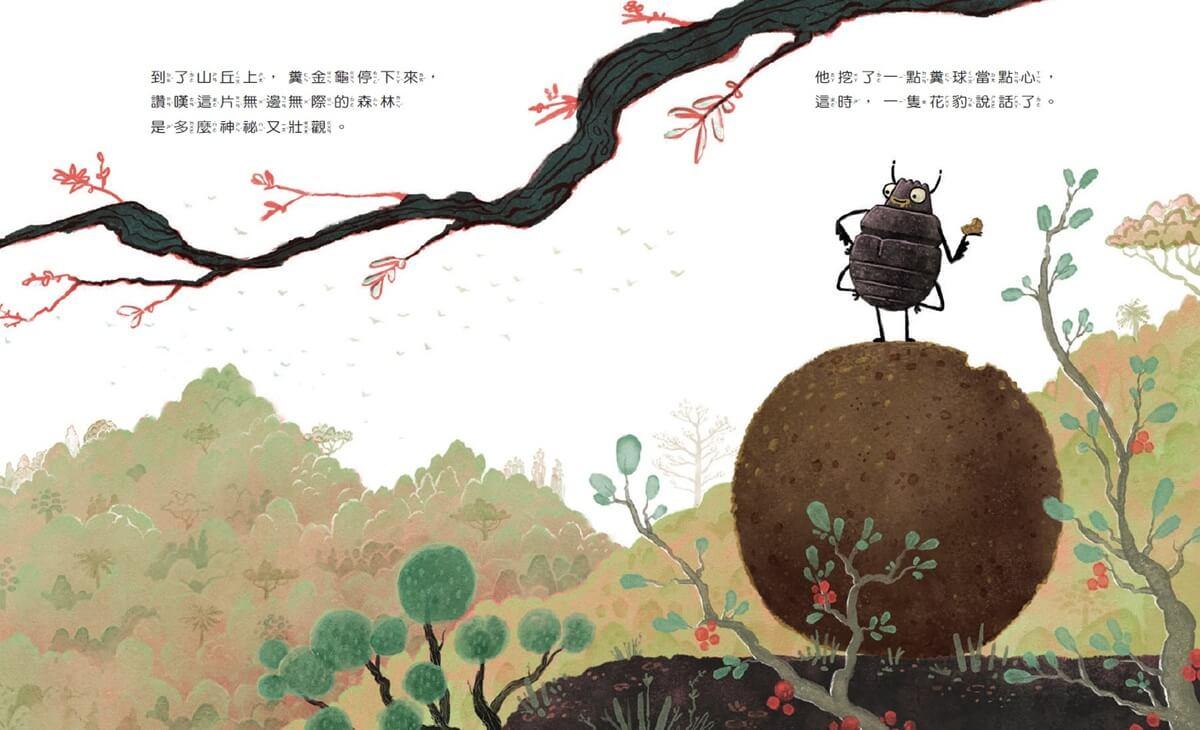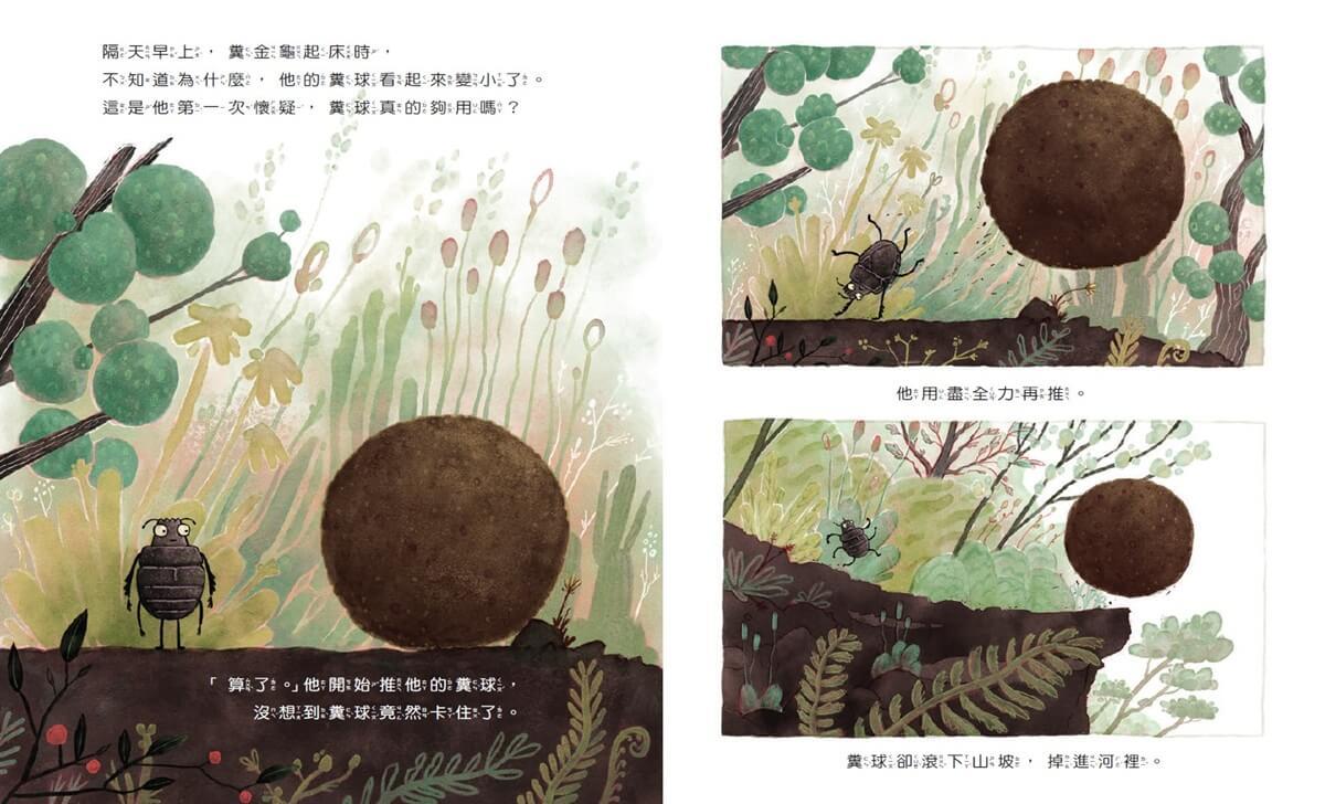 糞金龜每天過著簡單知足的生活,他清晨出門,在河邊等待──「啪噠!」一坨新鮮的大便從天而降,他開心的推著糞球回家。他對所有的一切心懷感激,即使辛苦了大半天,他也覺得森林給的剛好都夠用。
